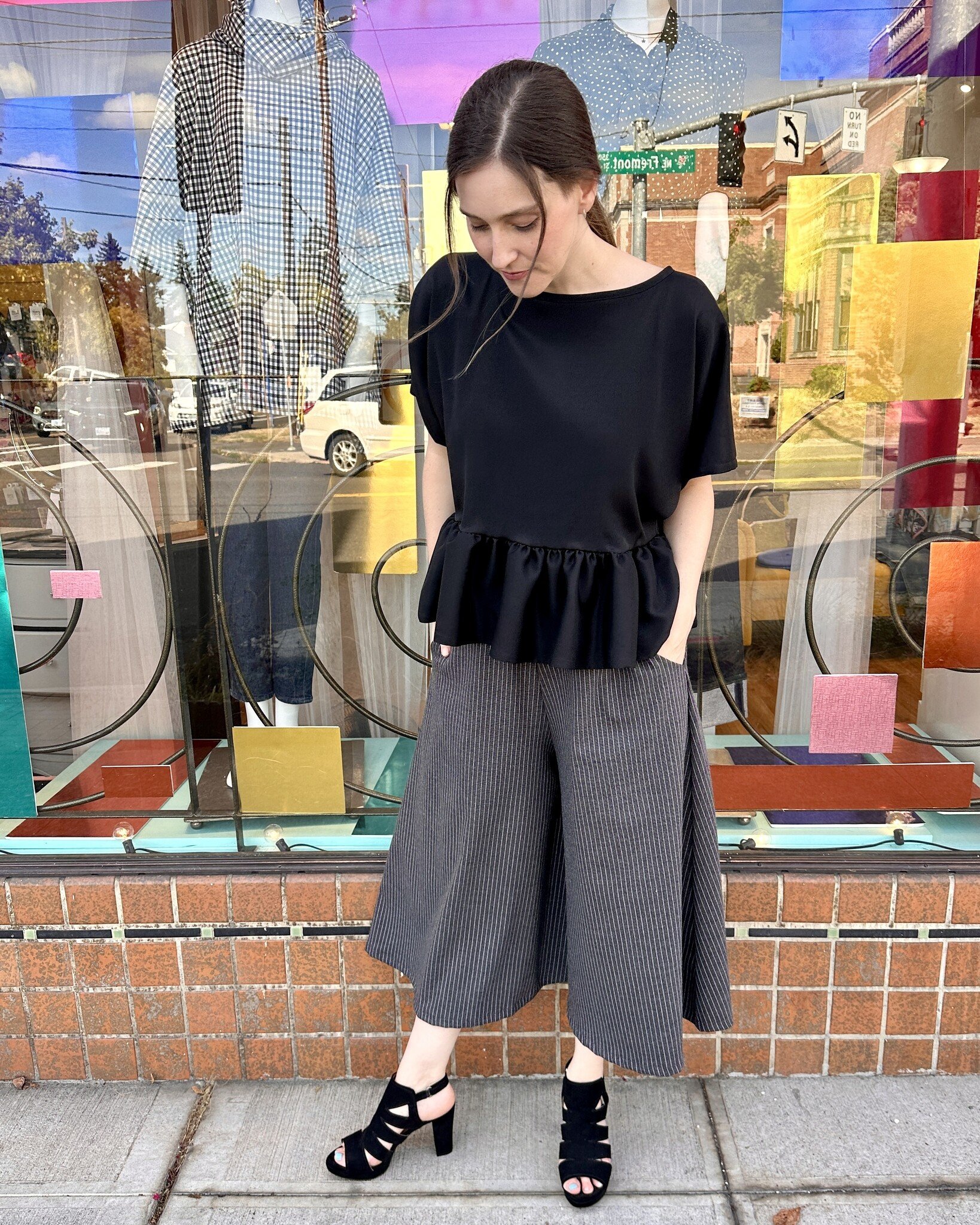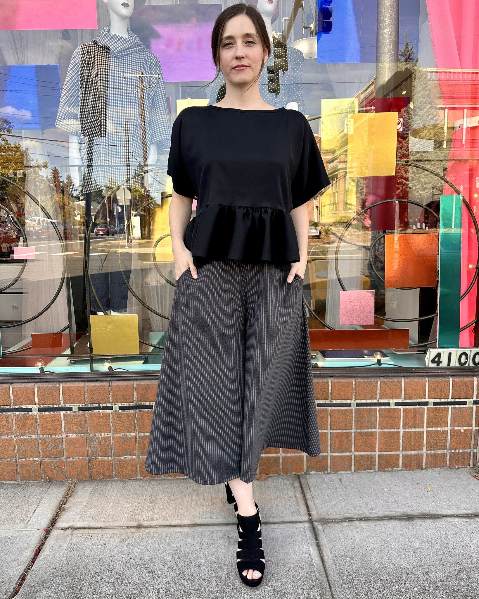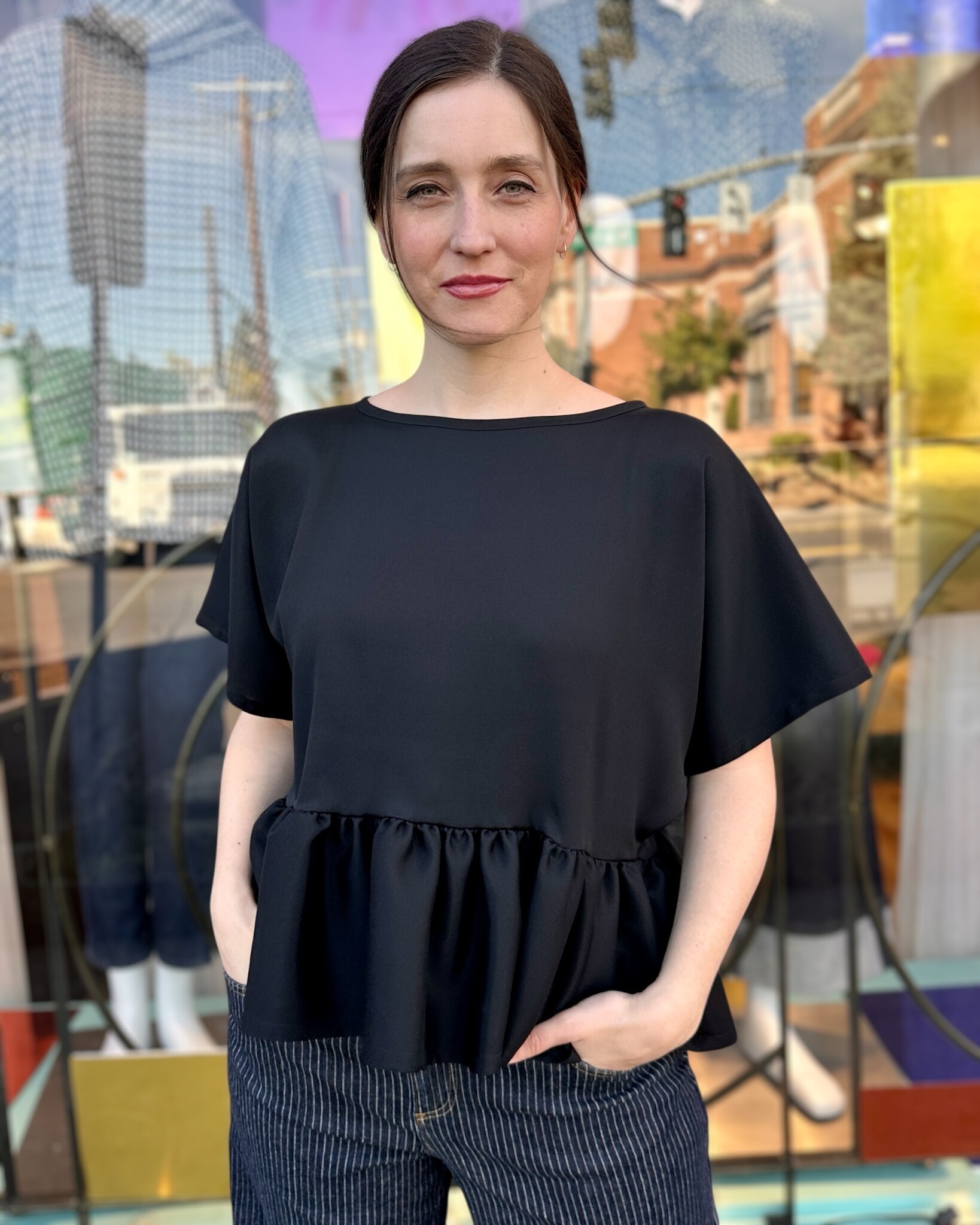 It's an Abbie Top! I love this flouncy little loose top. Layer over your favorite turtleneck or simple dress. So cute! Love this paired with a Charmaine skirt too or Trista Pants. Tres Chic!