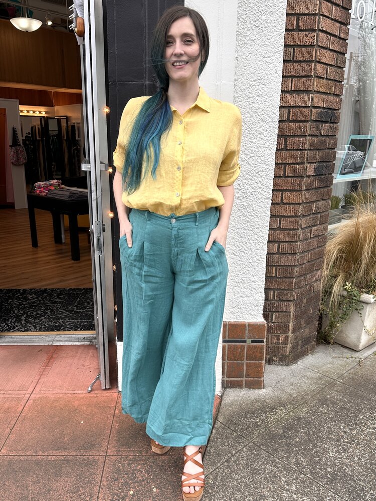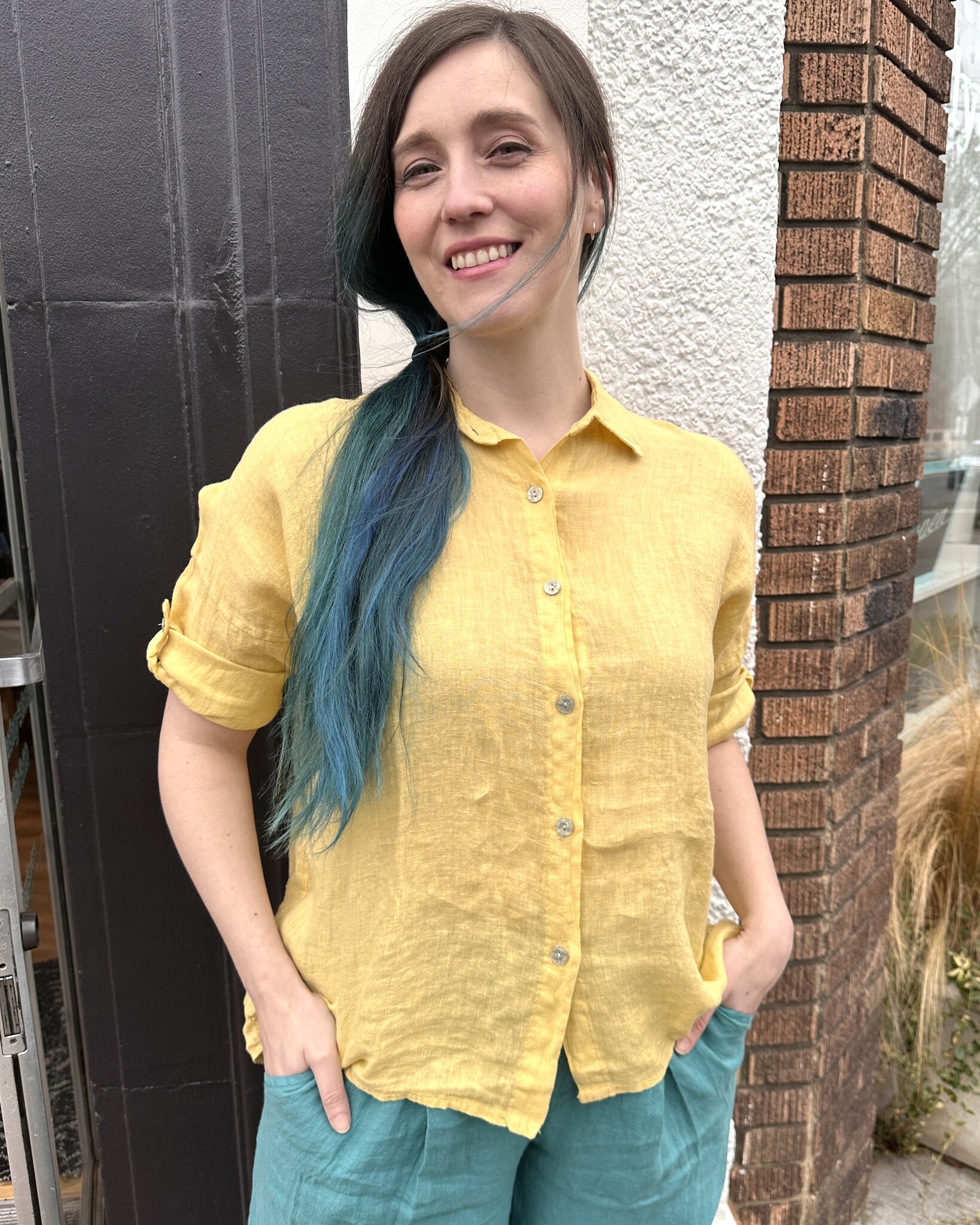 Classic style button down linen blouse with tabbed sleeve. Rolled and tabbed sleeve is above the elbow. Unrolled it is 3/4 sleeve.