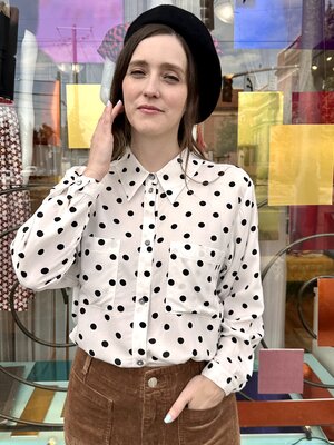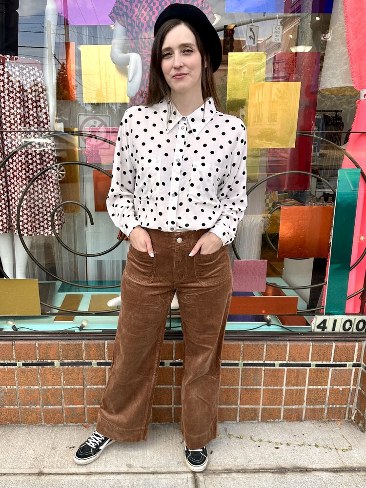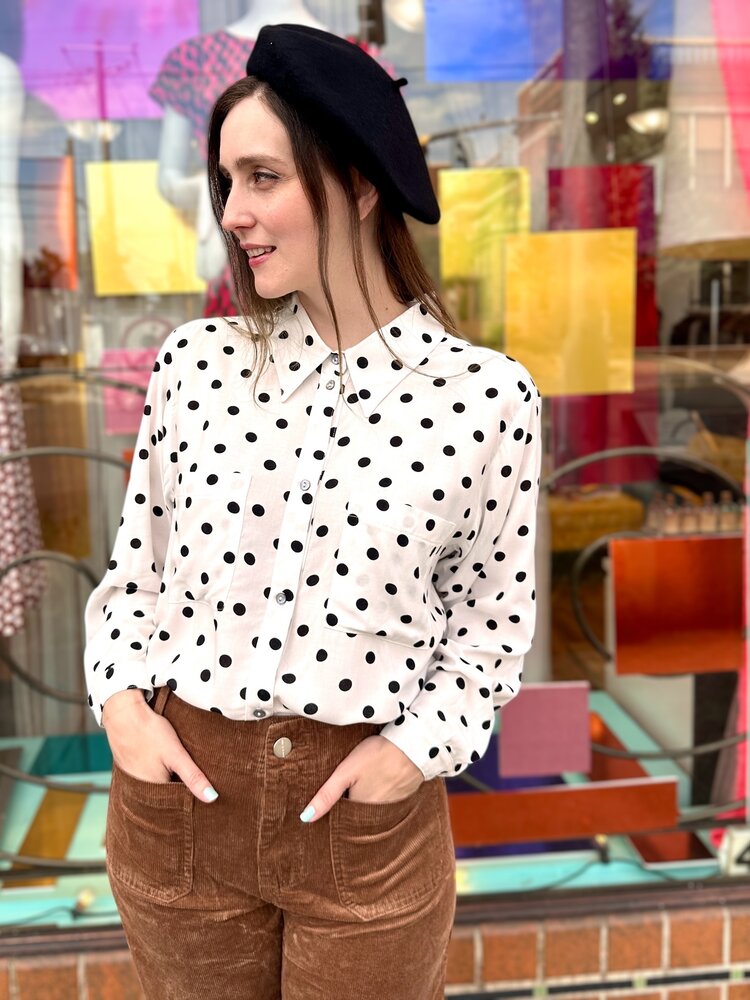 Blousy fit with pockets and cuff detail. Wide collar button up blouse.
