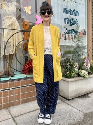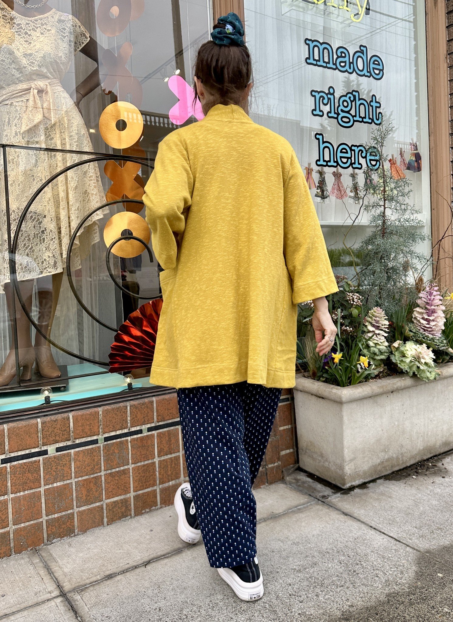 Easy fit, cozy cardigan with giant pockets. 3/4 wide sleeves, shawl collar
