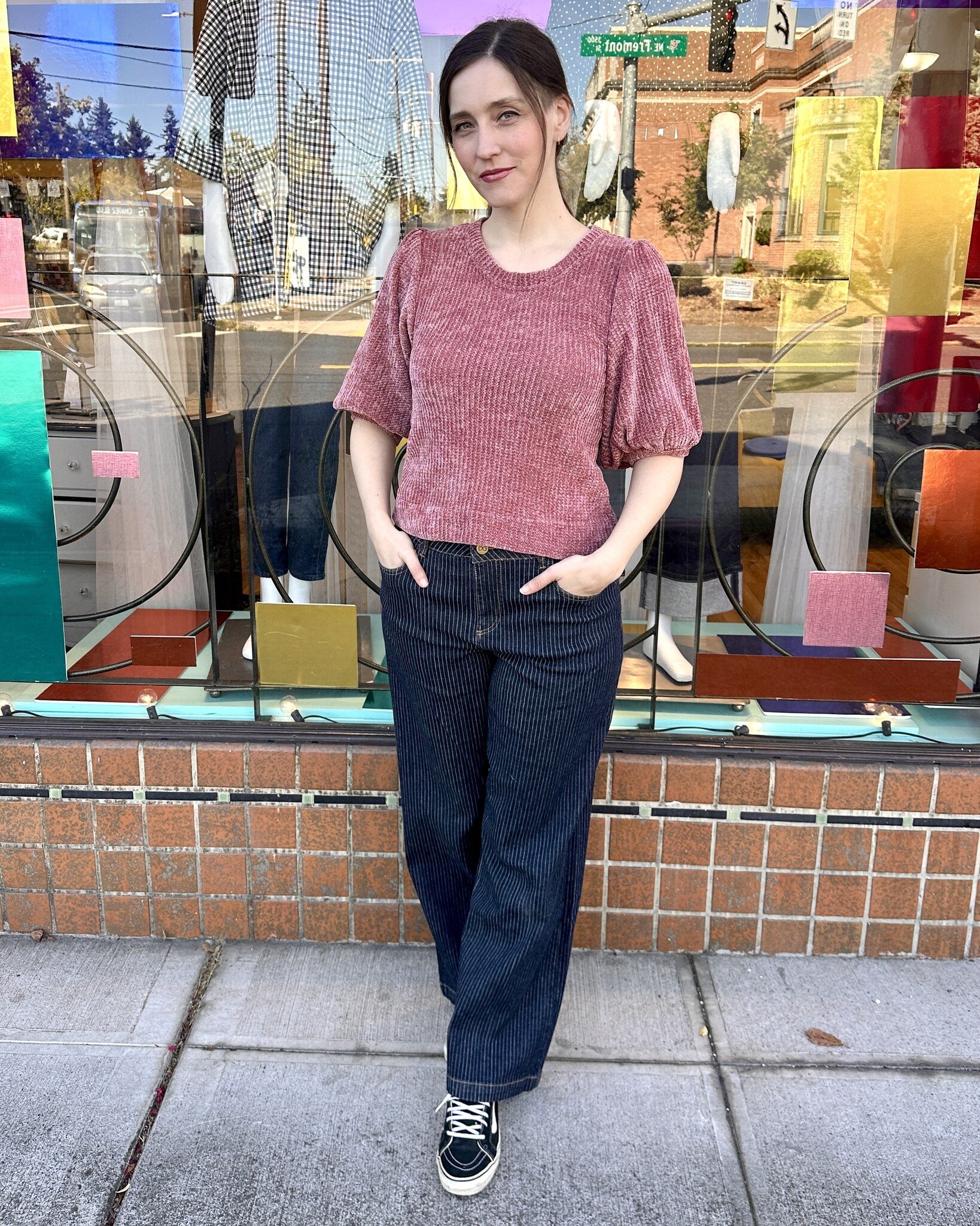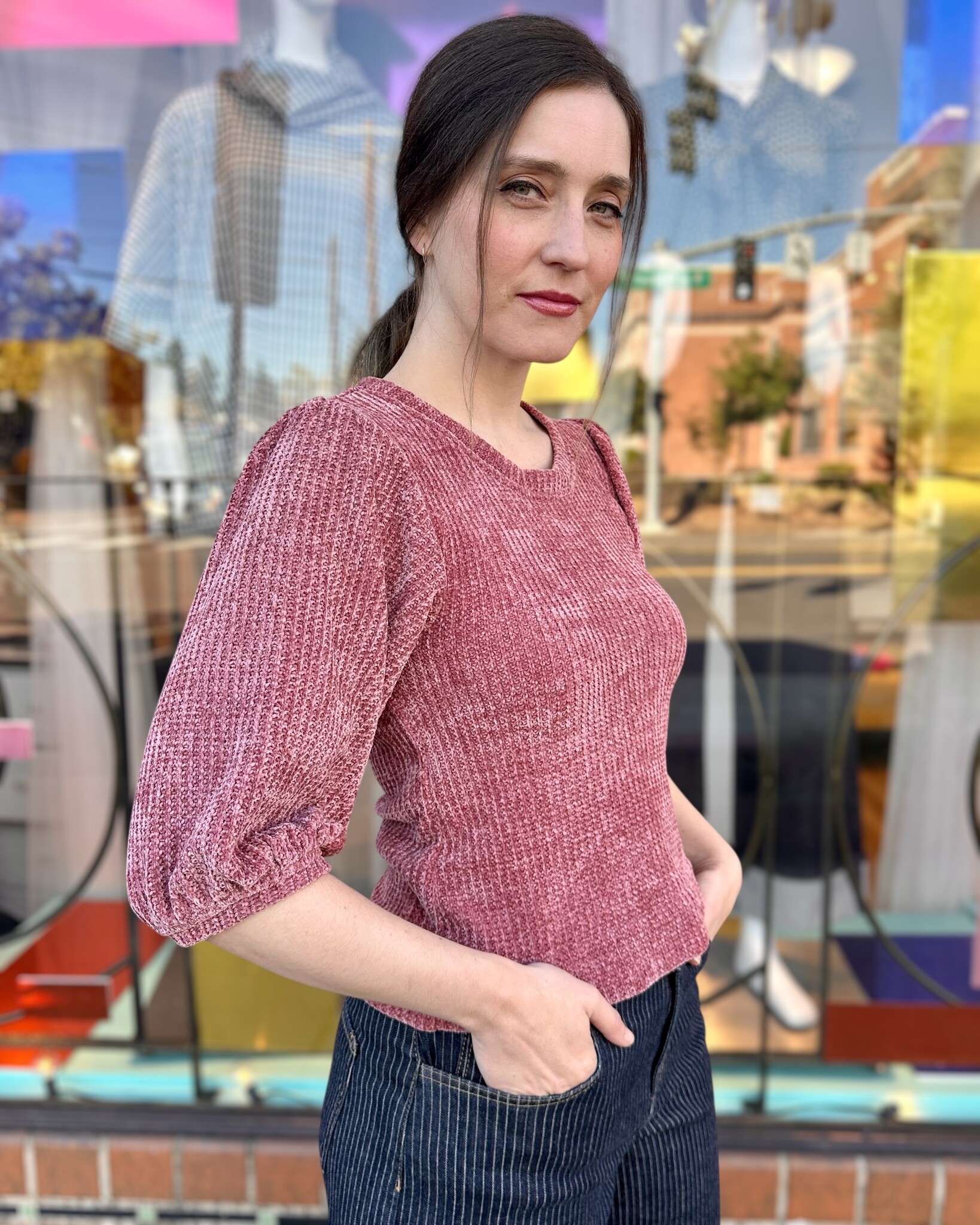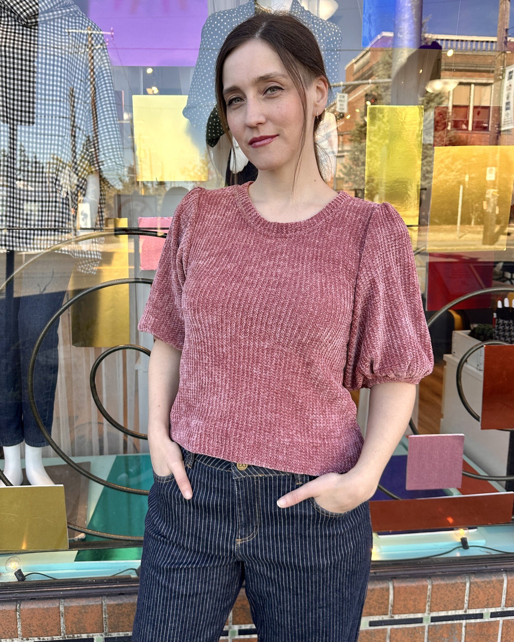 Cute lil fitted sweater with elbow length puffed sleeves and scoop neck. Super cozy chenille in the prettiest rose color.