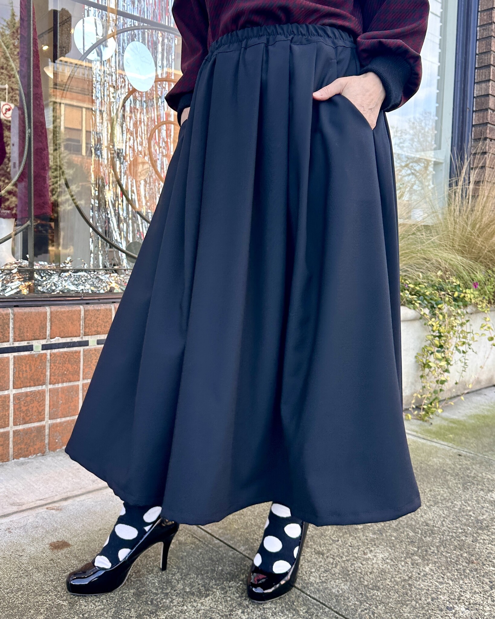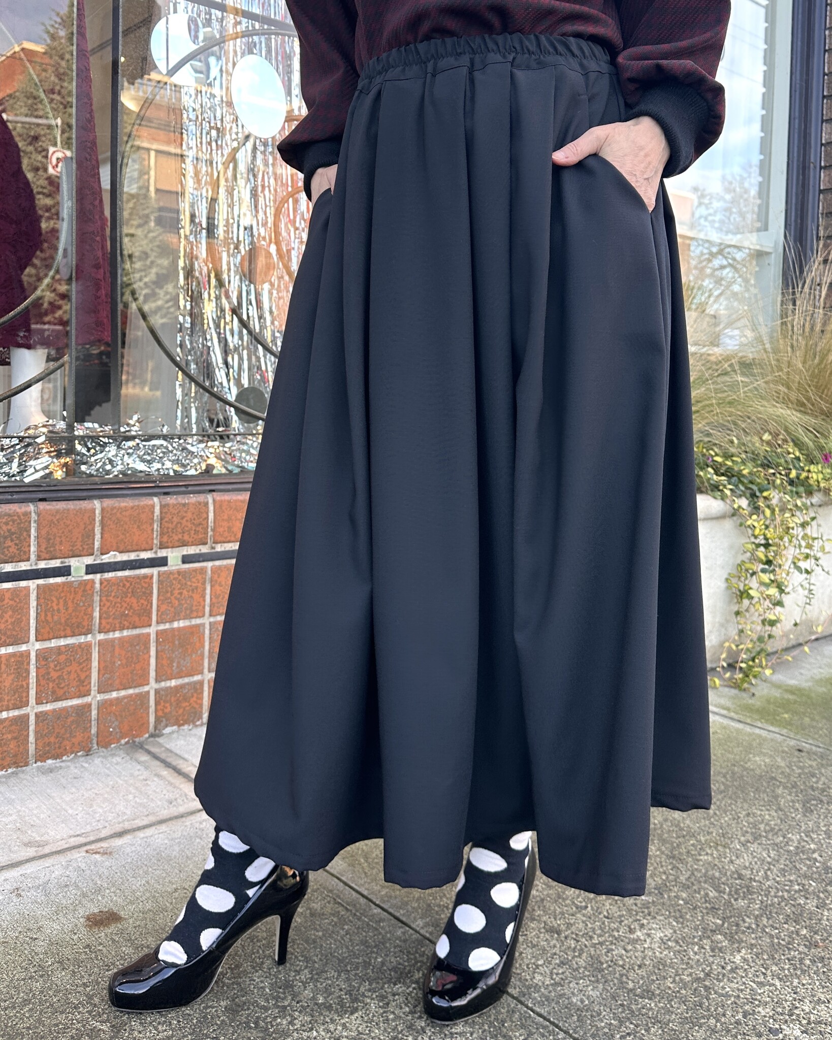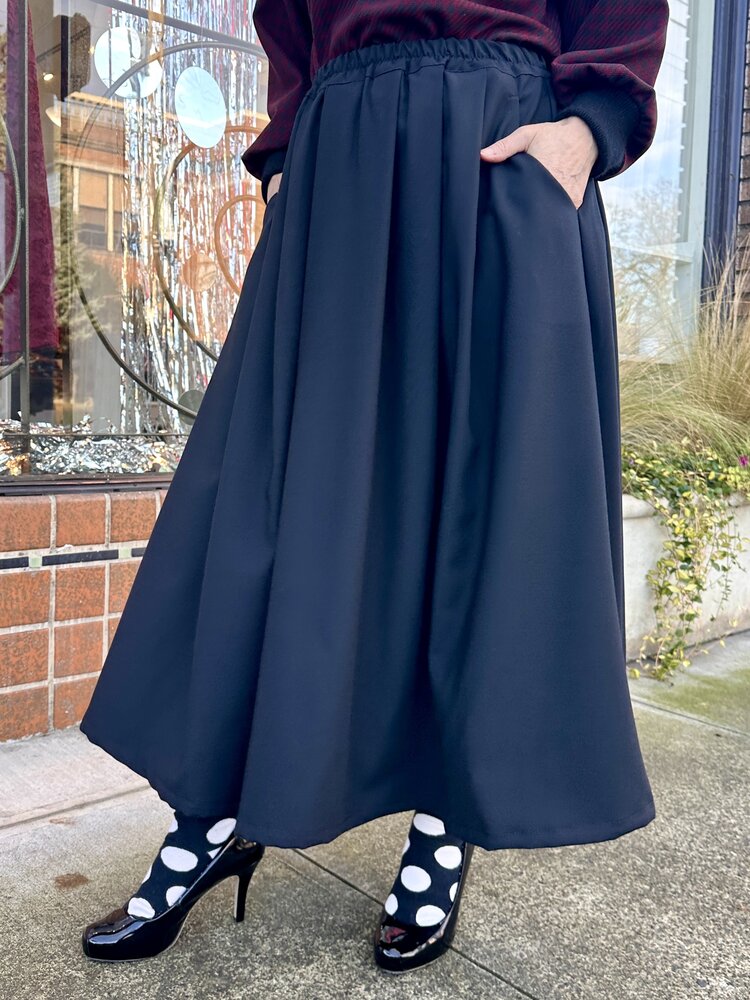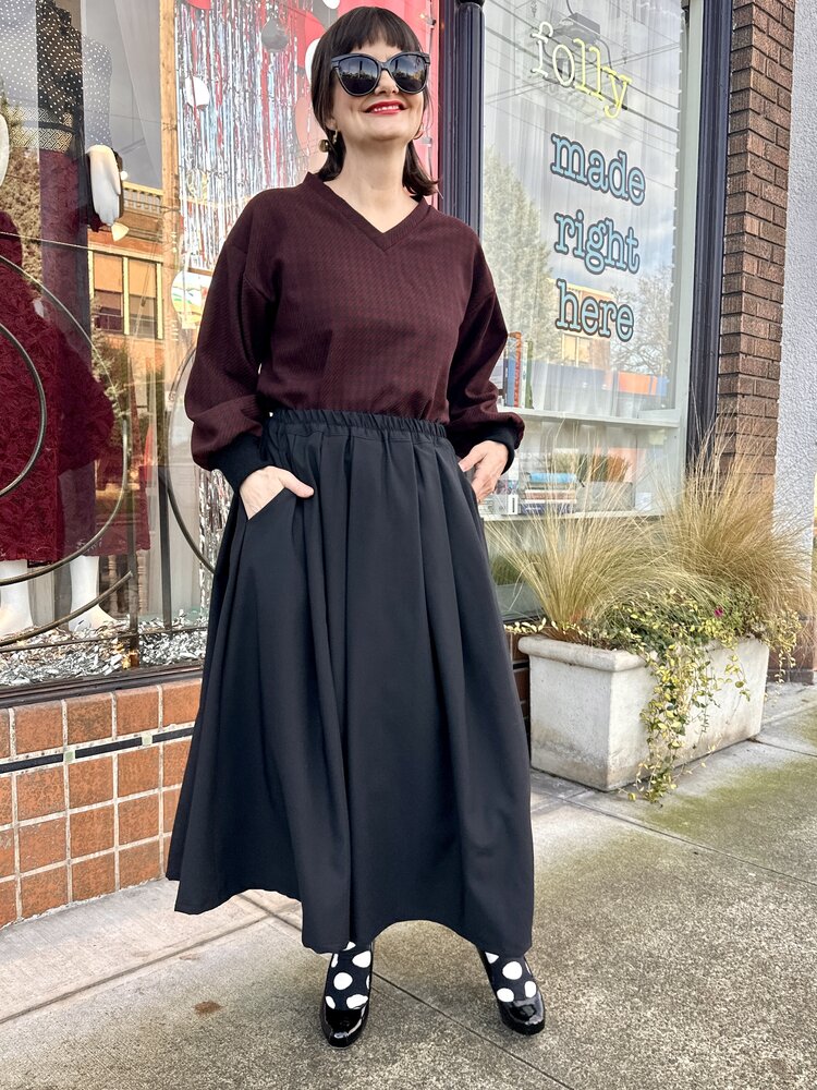 The lovely Charmaine Skirt is midi length, pleated, has an elastic waist and POCKETS!!