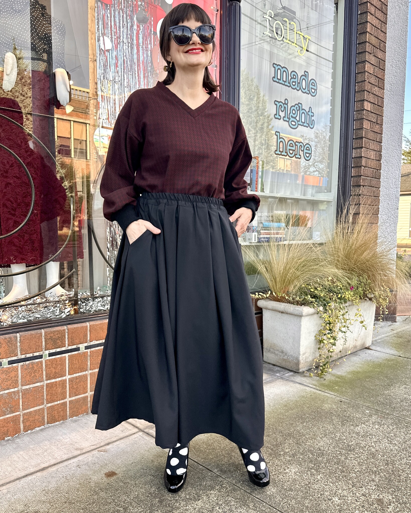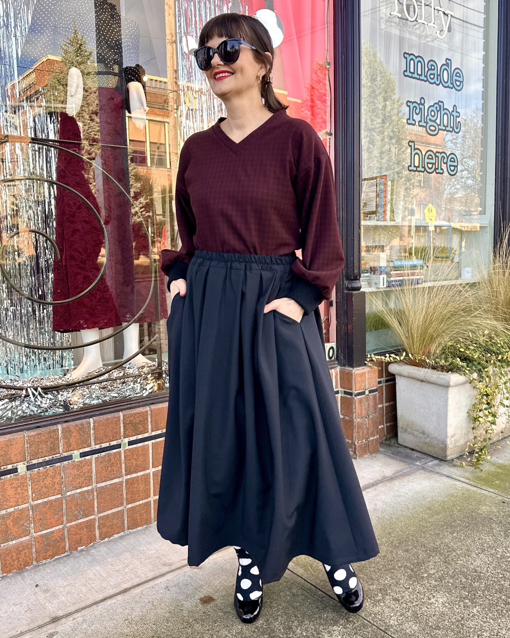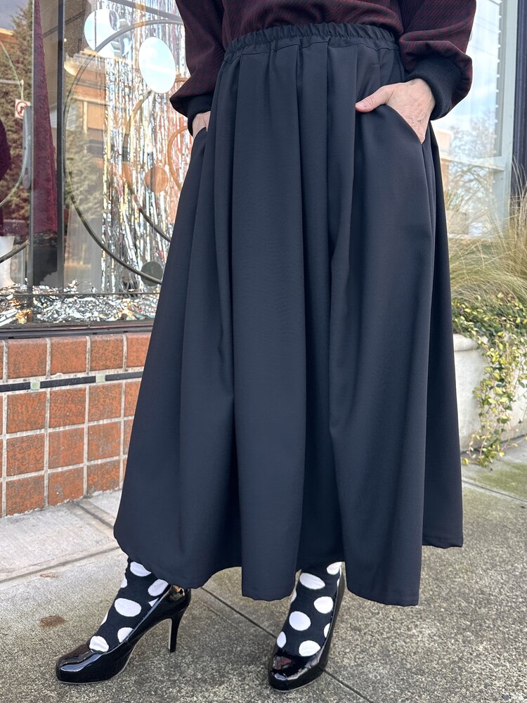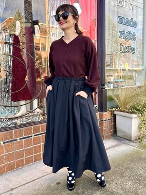 The lovely Charmaine Skirt is midi length, pleated, has an elastic waist and POCKETS!!