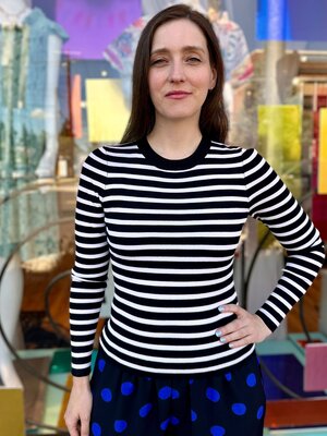 Fitted sweater tee in cute & bold black and white stripes.