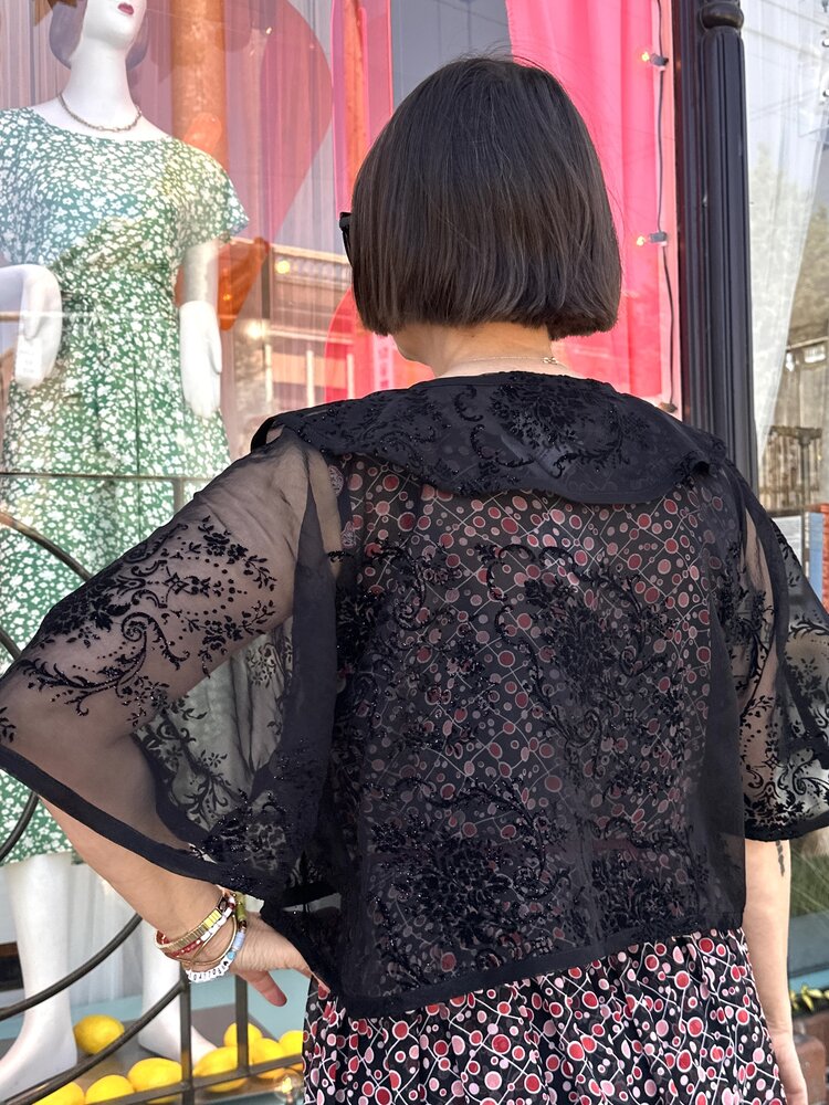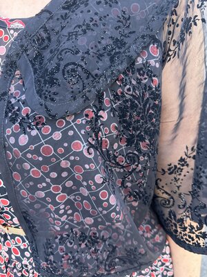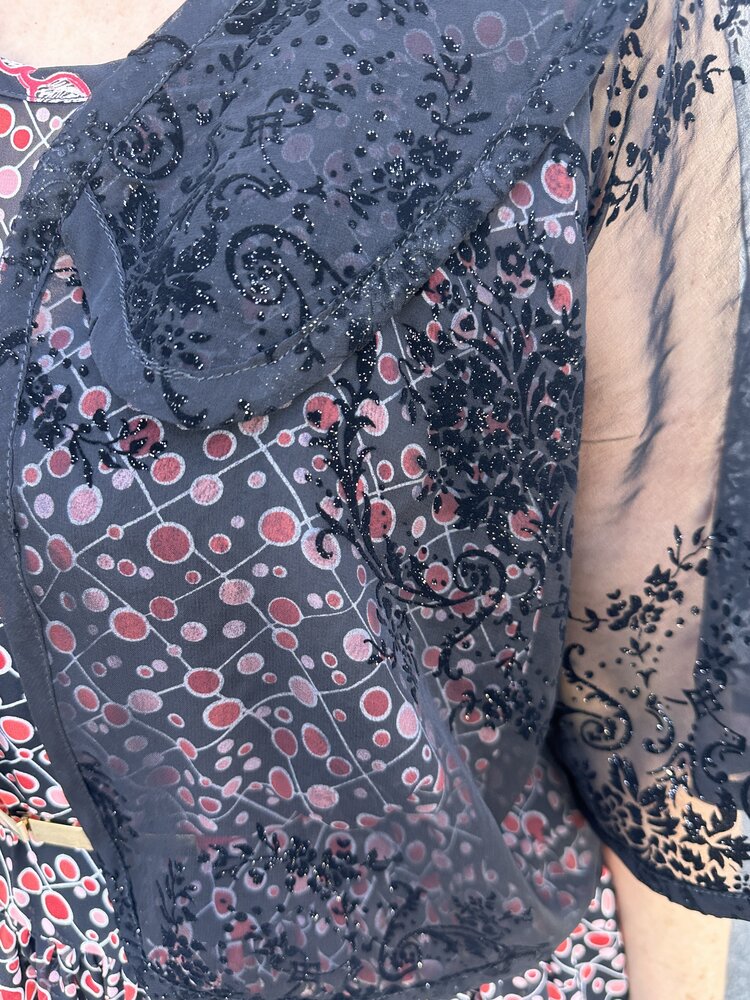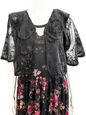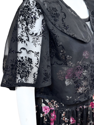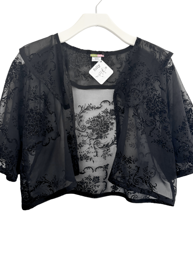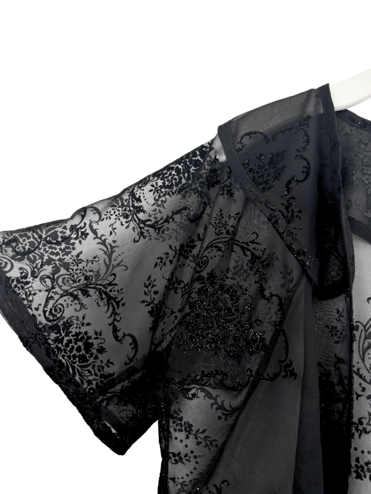 Black mesh over doodle that sparkles in the light! Super sheer nylon with flocked floral design and glitter.