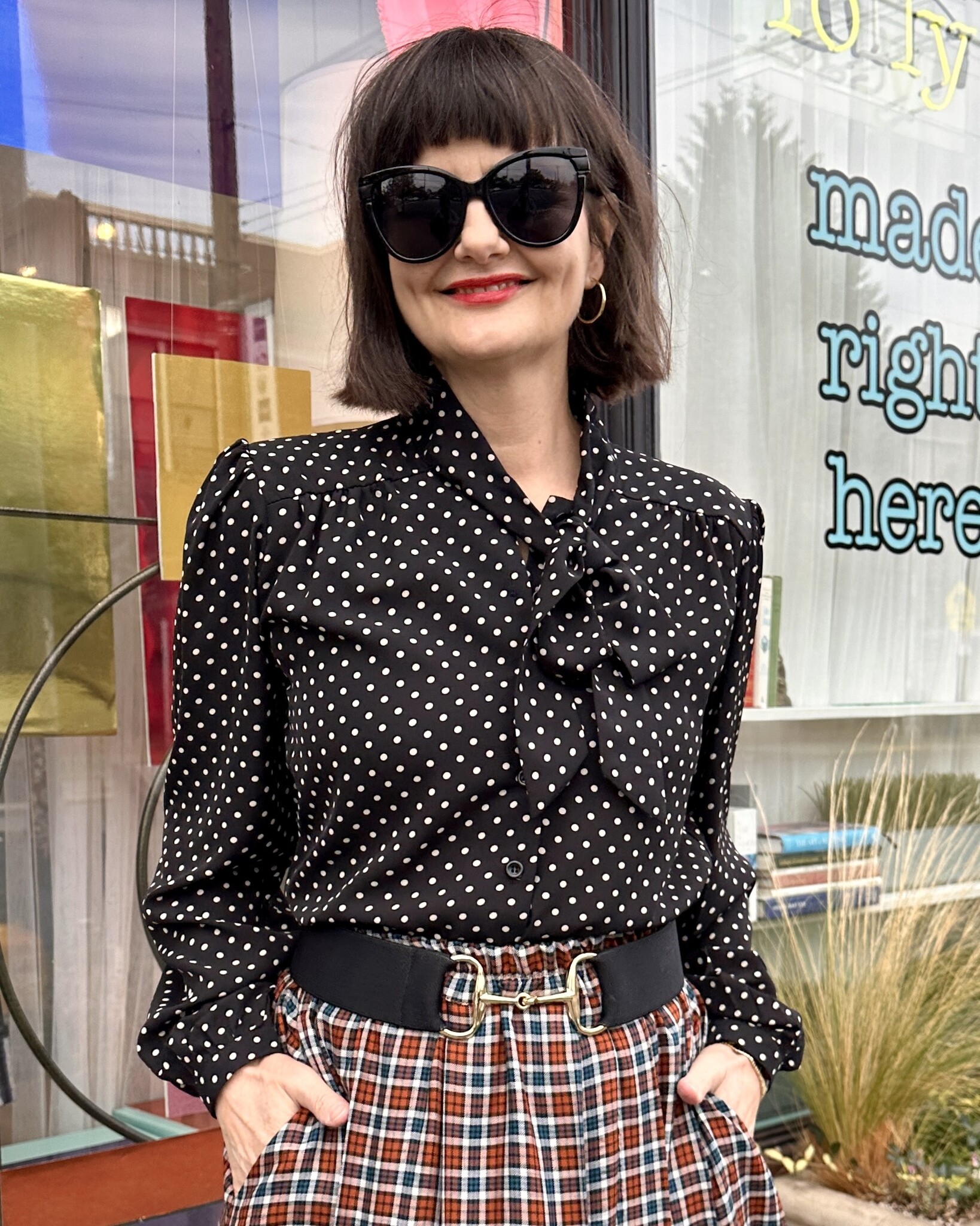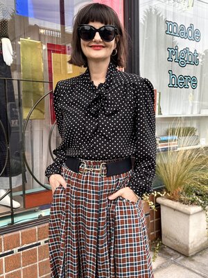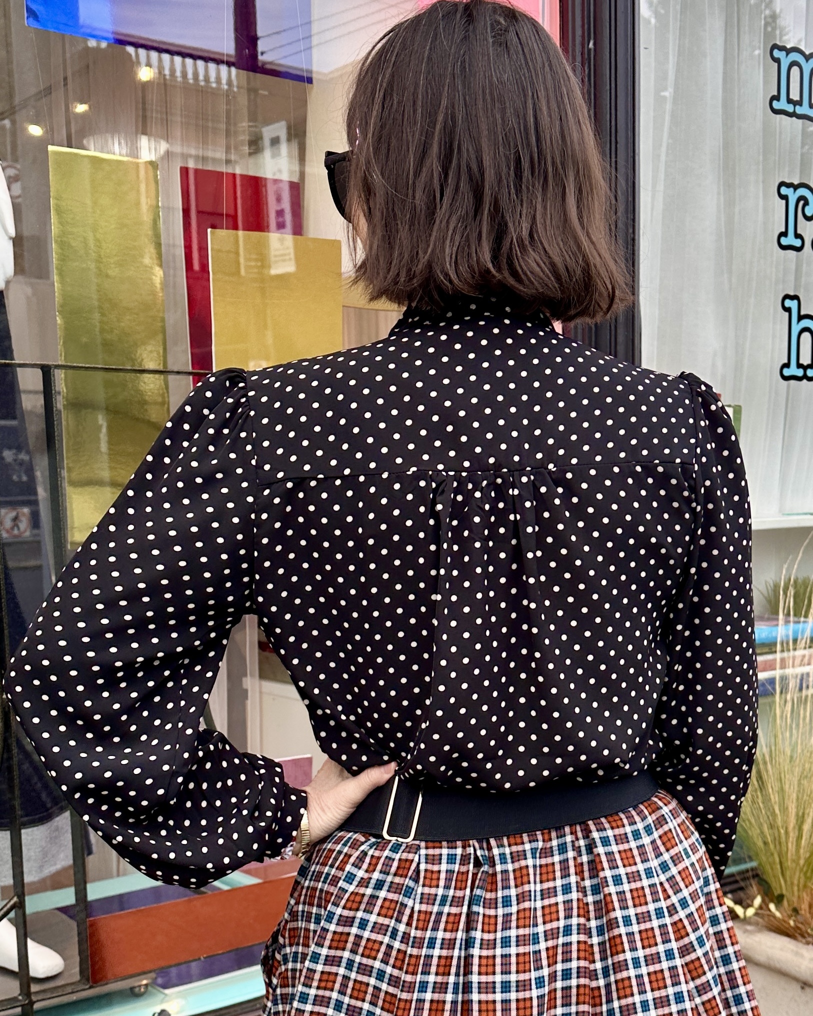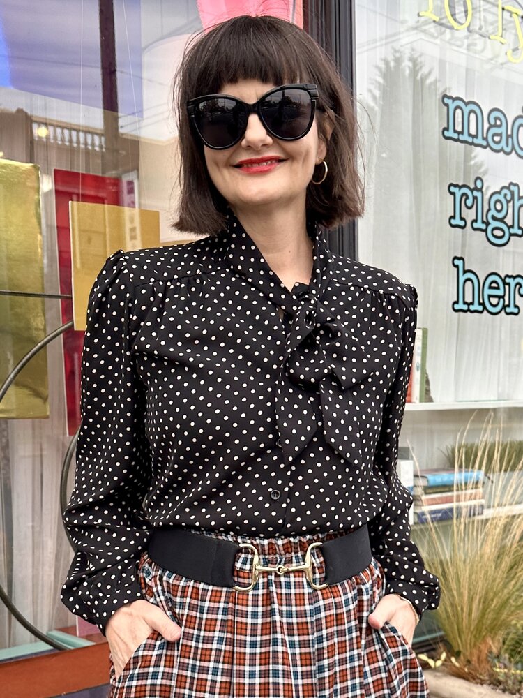 So cute! The Darline blouse in black dot is so good with everything. Or pair with your favorite jeans.