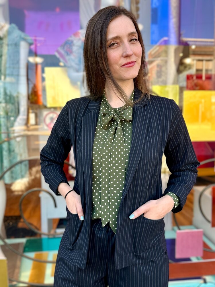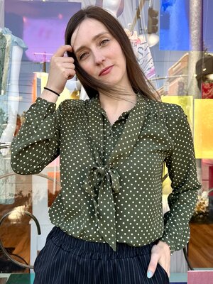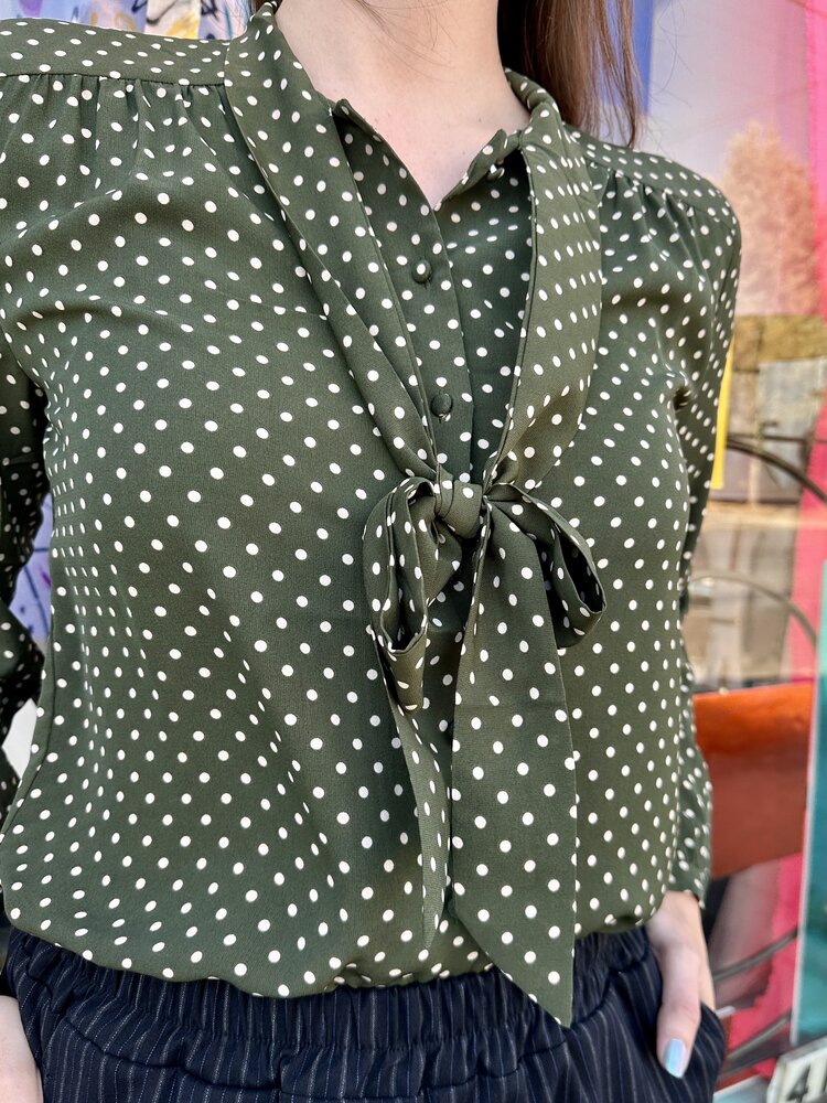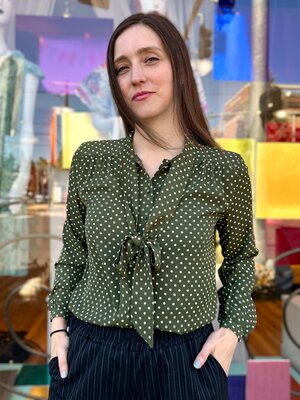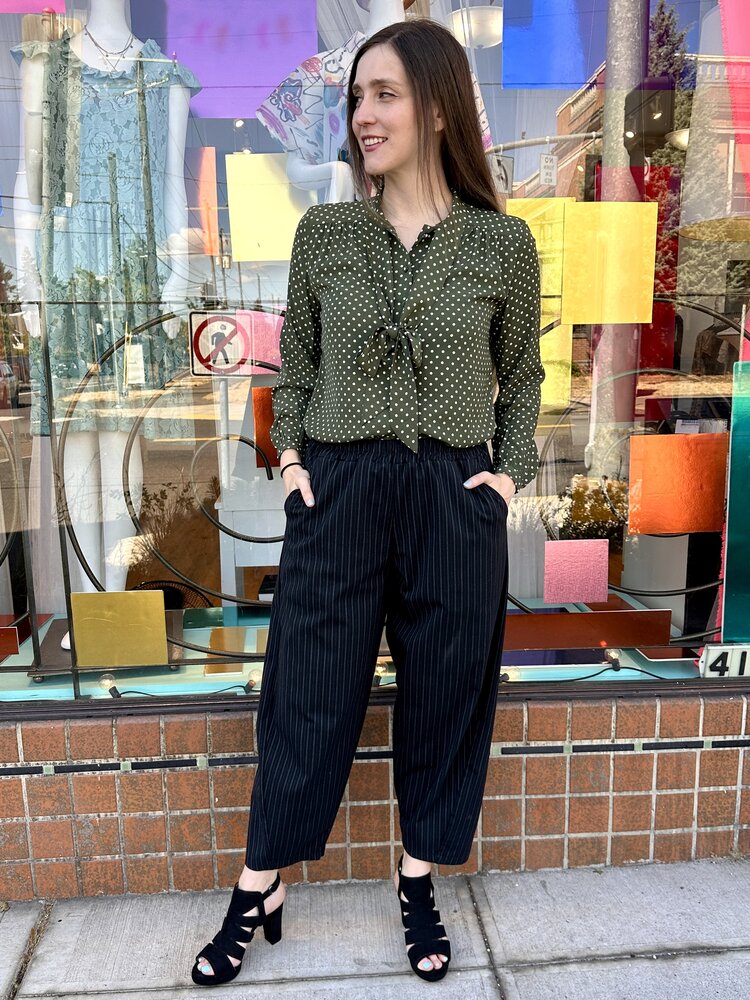 So cute! The Darline blouse in olive dot is so good with the Miles/ Patricia in District. Or pair with your favorite jeans.