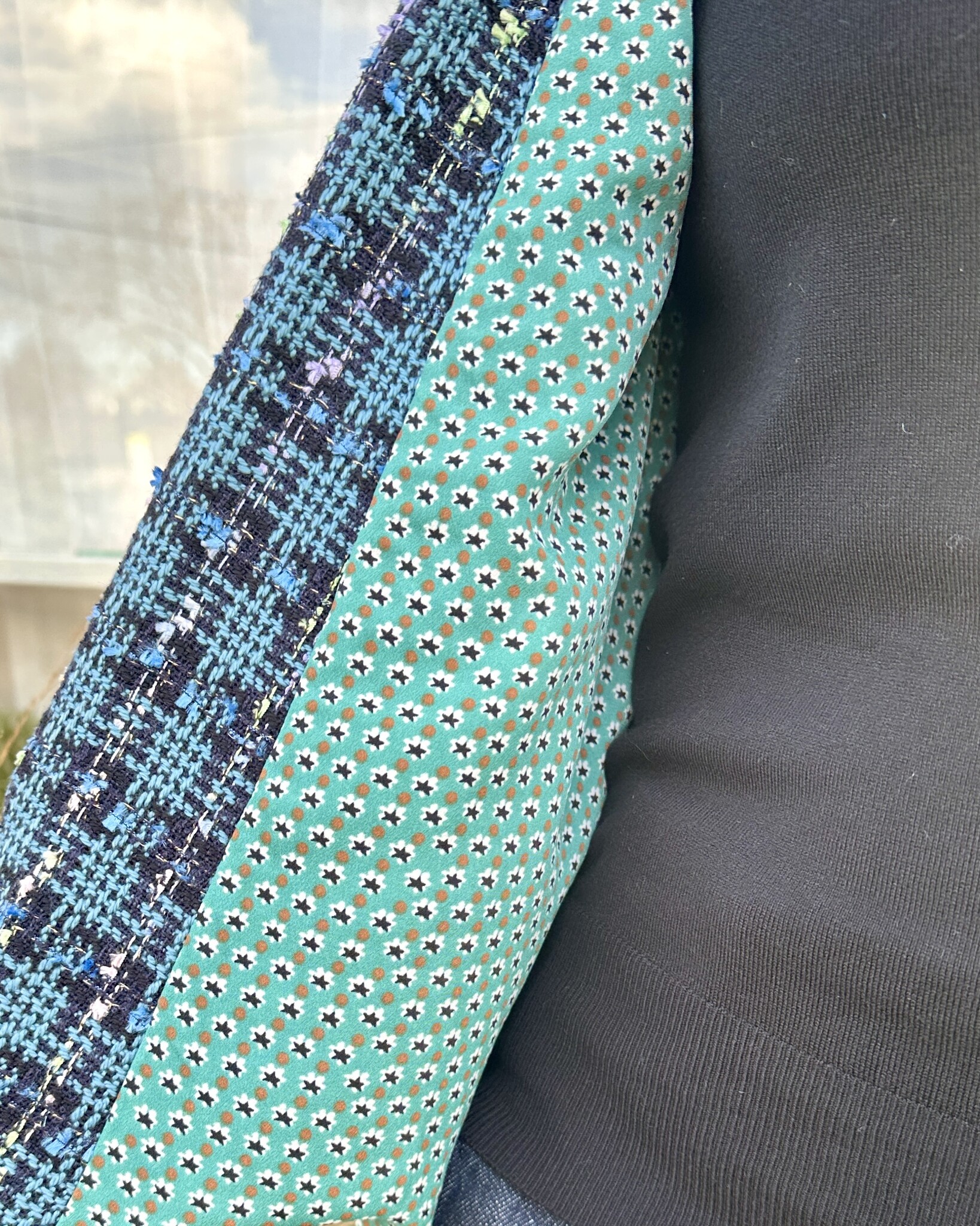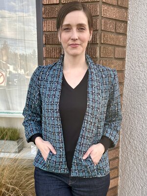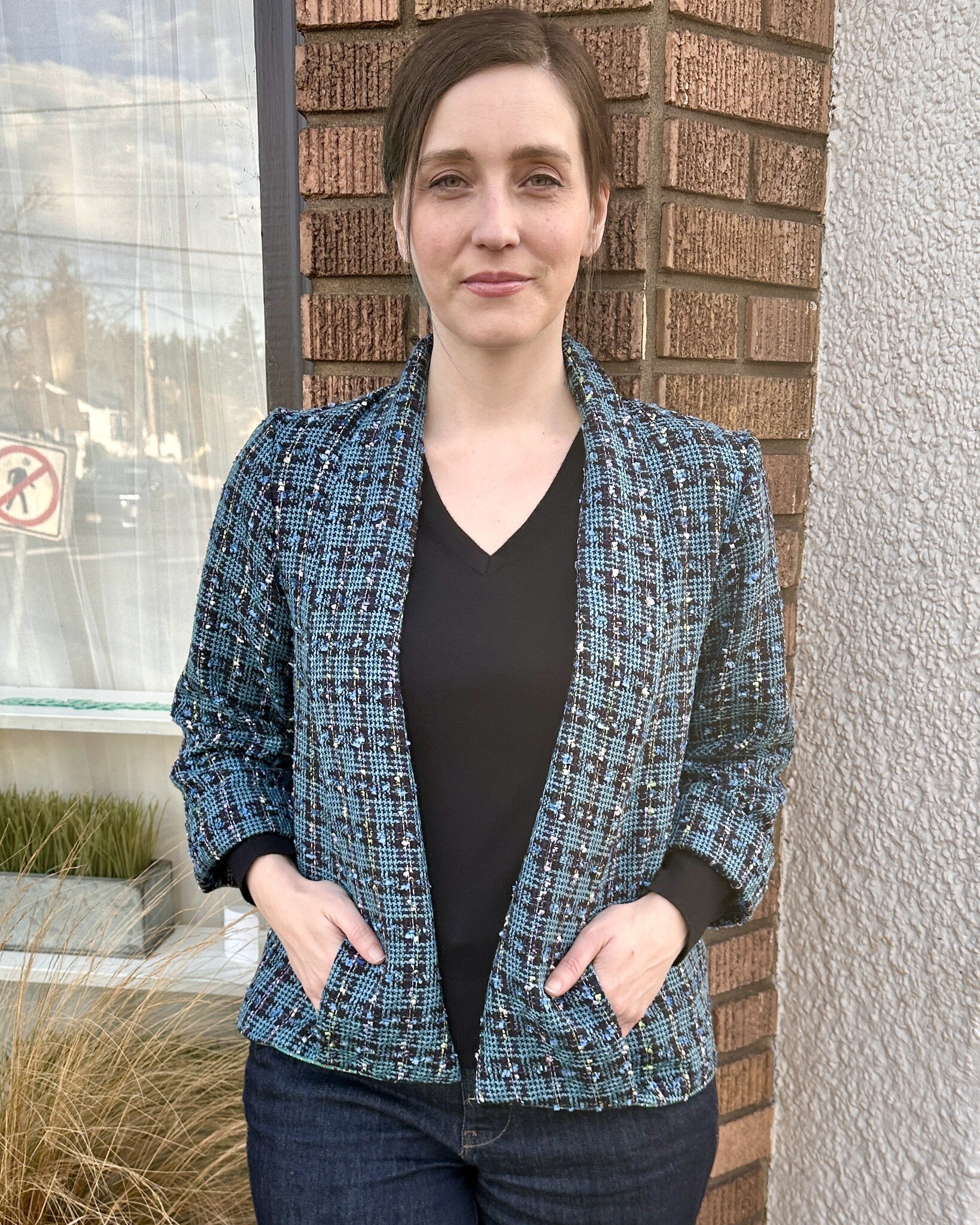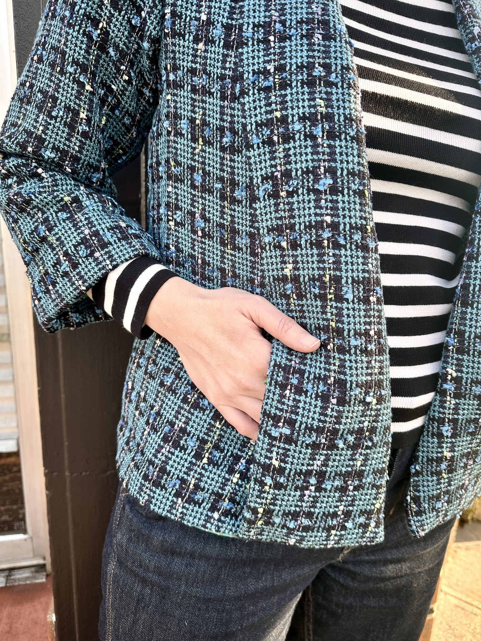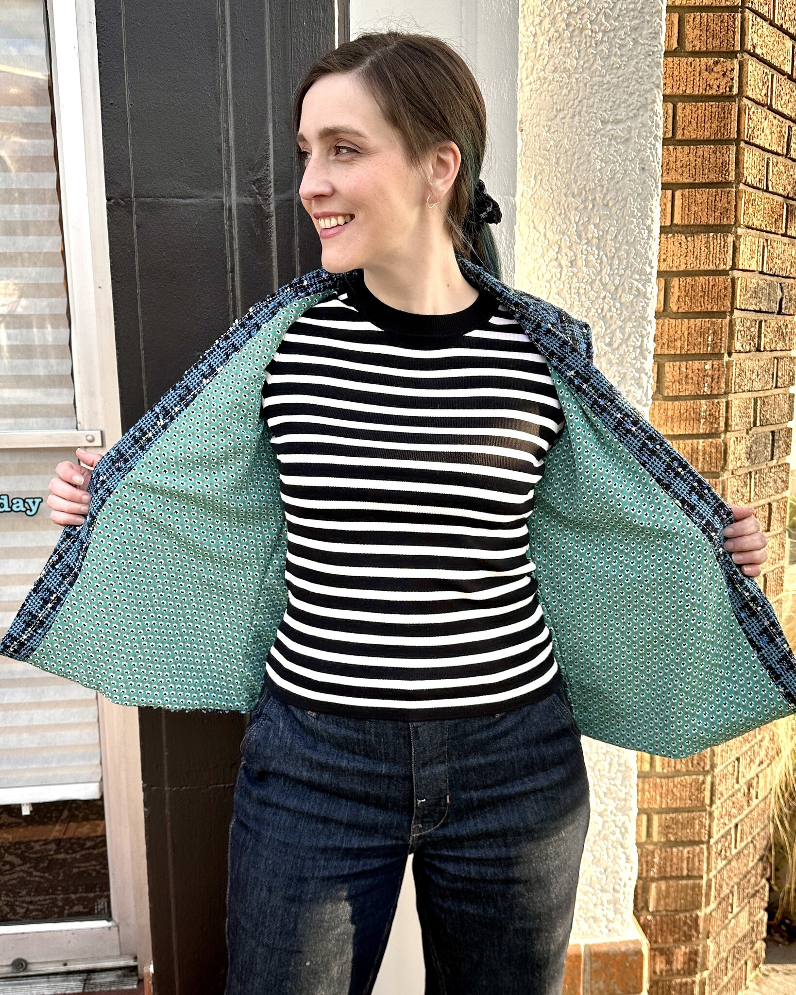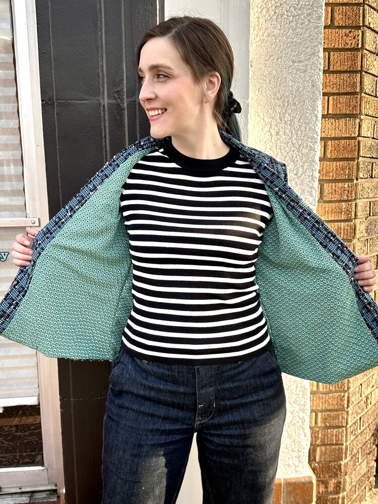Cutest little jacket! Shawl collar doubles as hand pockets. The cutest lining!