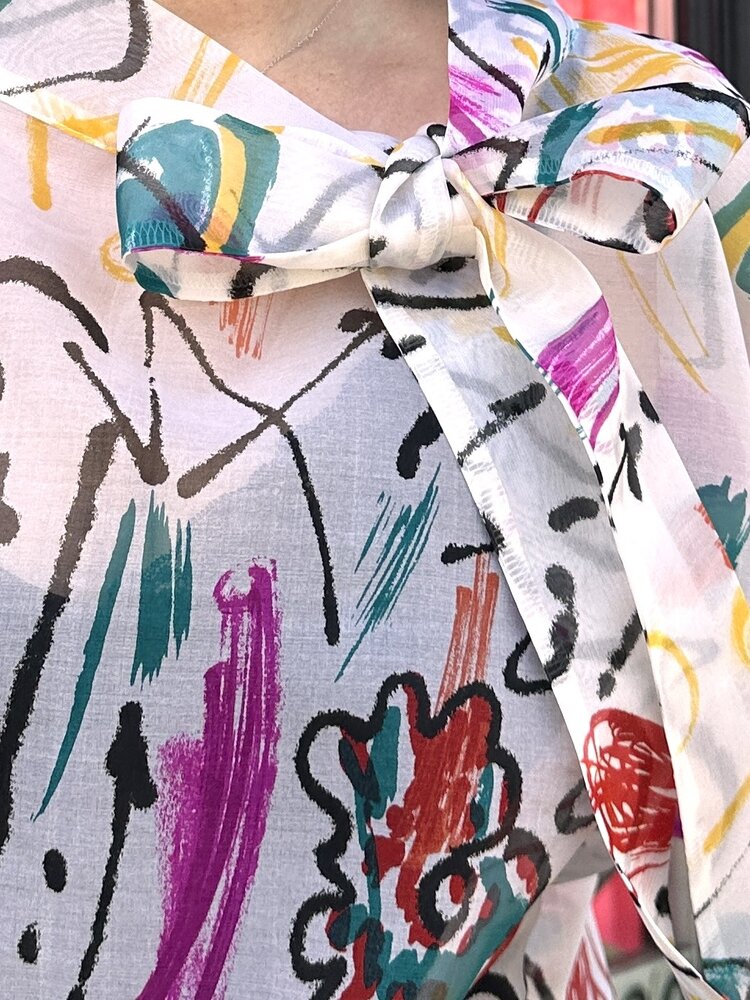 This one is definitely smaller than some Paulies, please ask questions if you are unsure of sizing. No stretch at all to this silk.