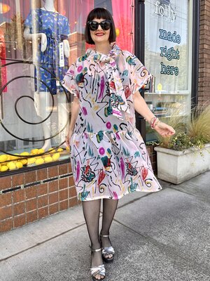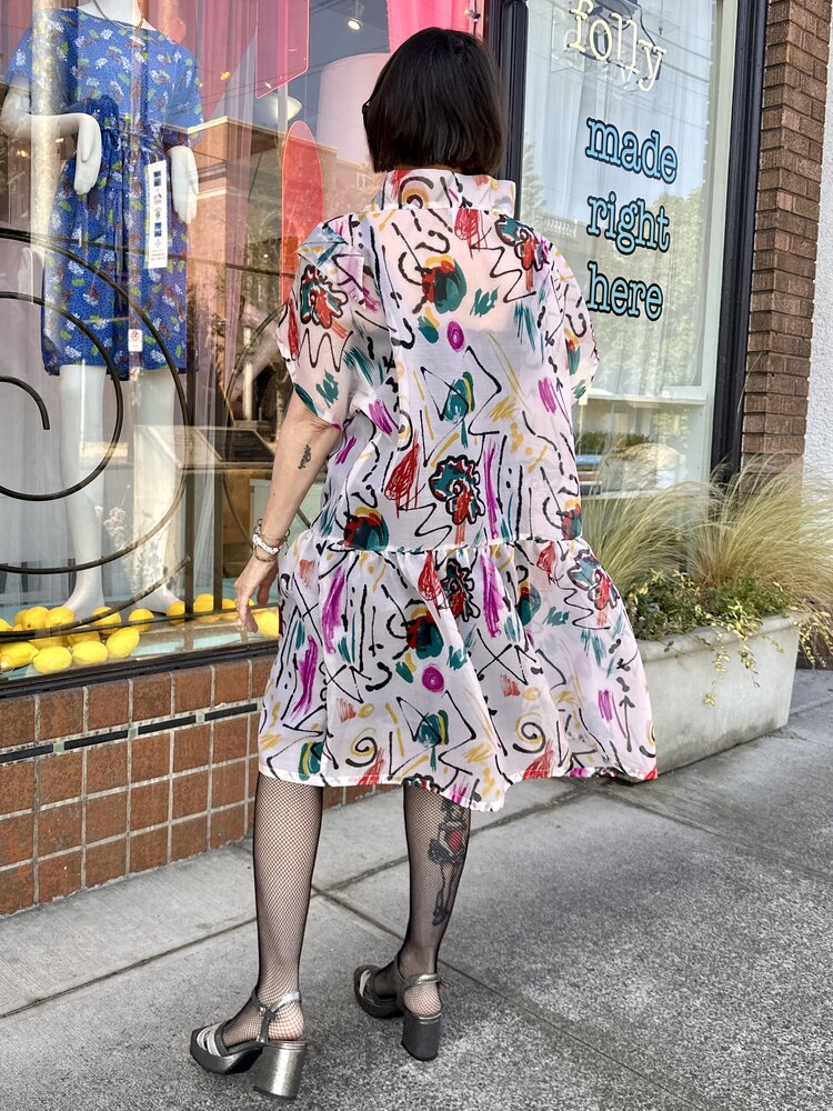 Paulie is a loose-n-easy dress with a drop waist, ruffle, and wide neck. A perfect dress to throw on over anything you want! Easy fit. I love to layer Paulie over leggings and a turtleneck too!
