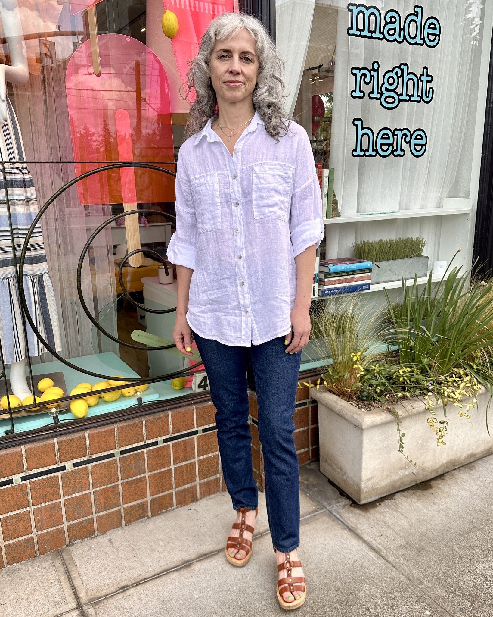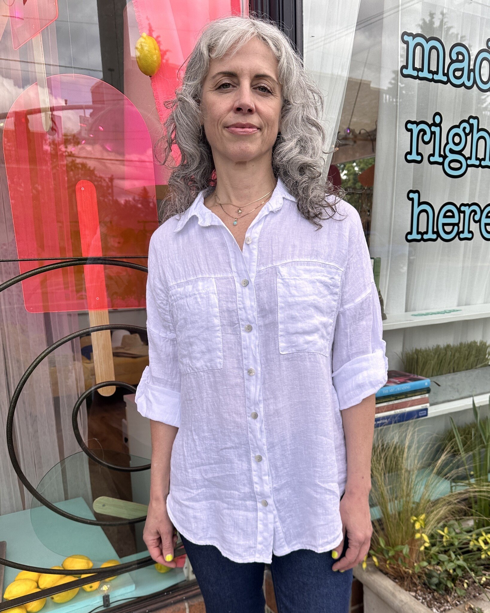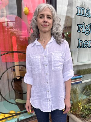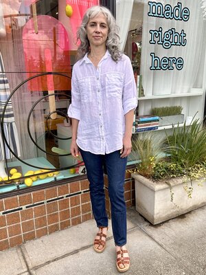 Classic style button down linen blouse with tabbed sleeve.