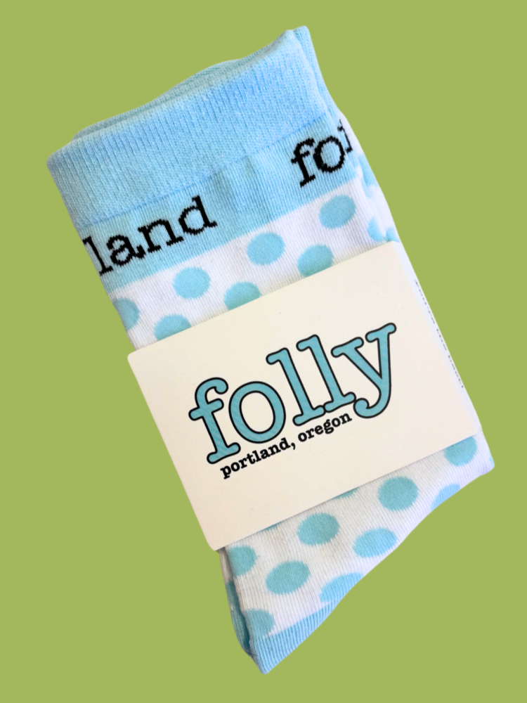 Folly blue and white socks with polka dots.