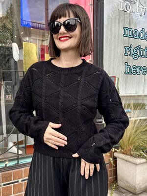 Open texture. Slightly cropped but not crazy short. black sweater with long sleeves.