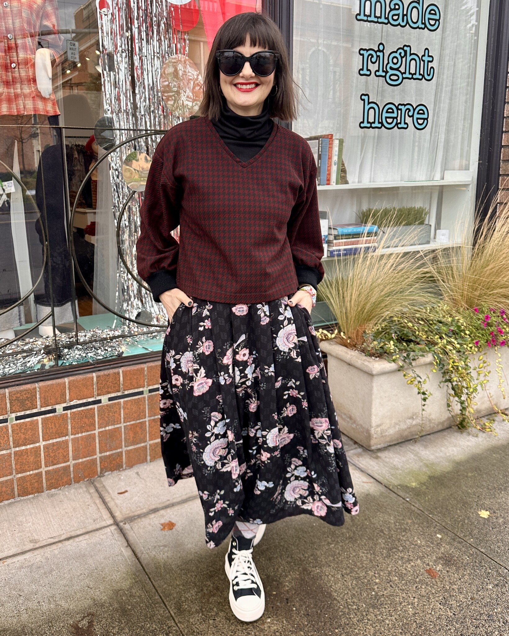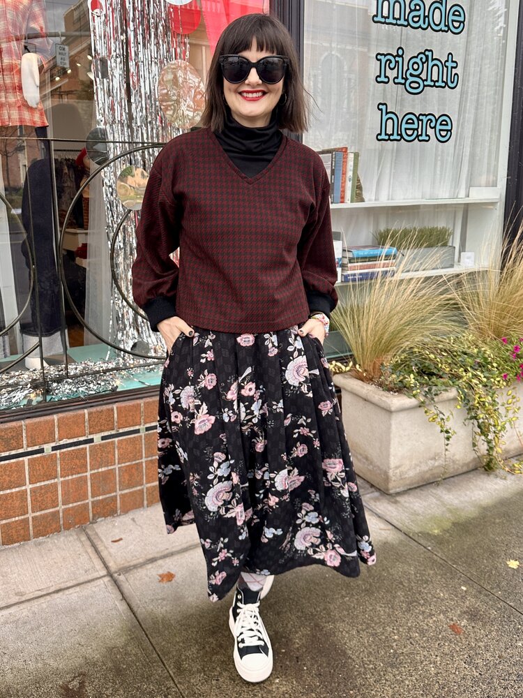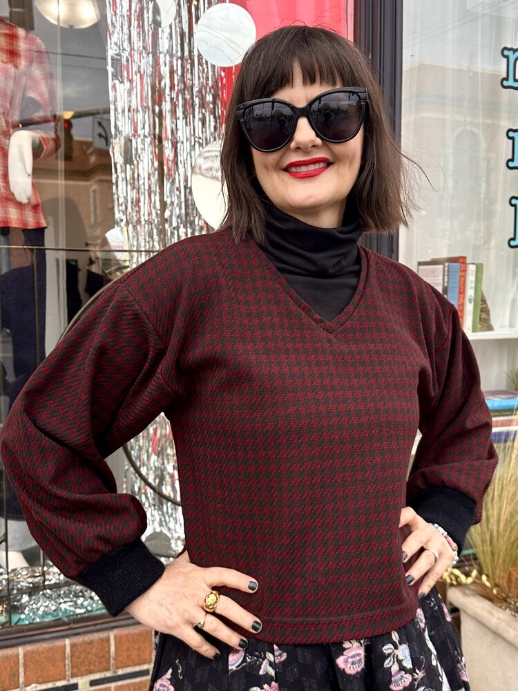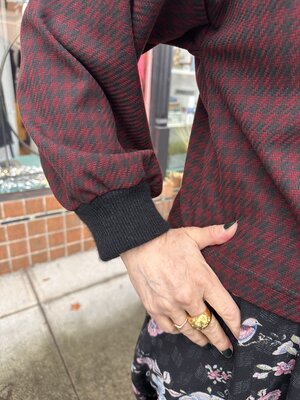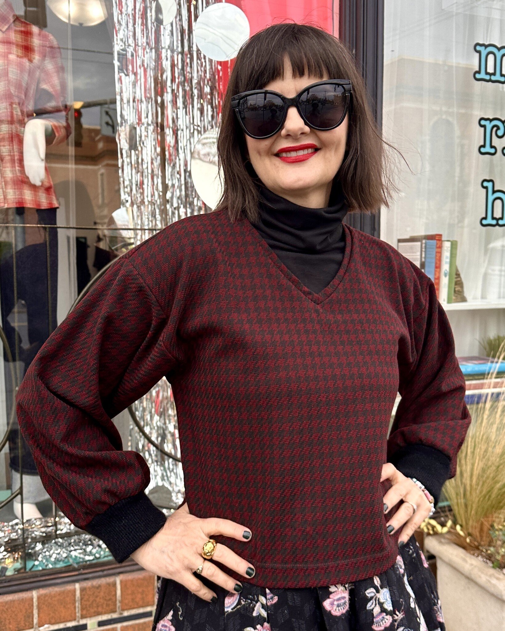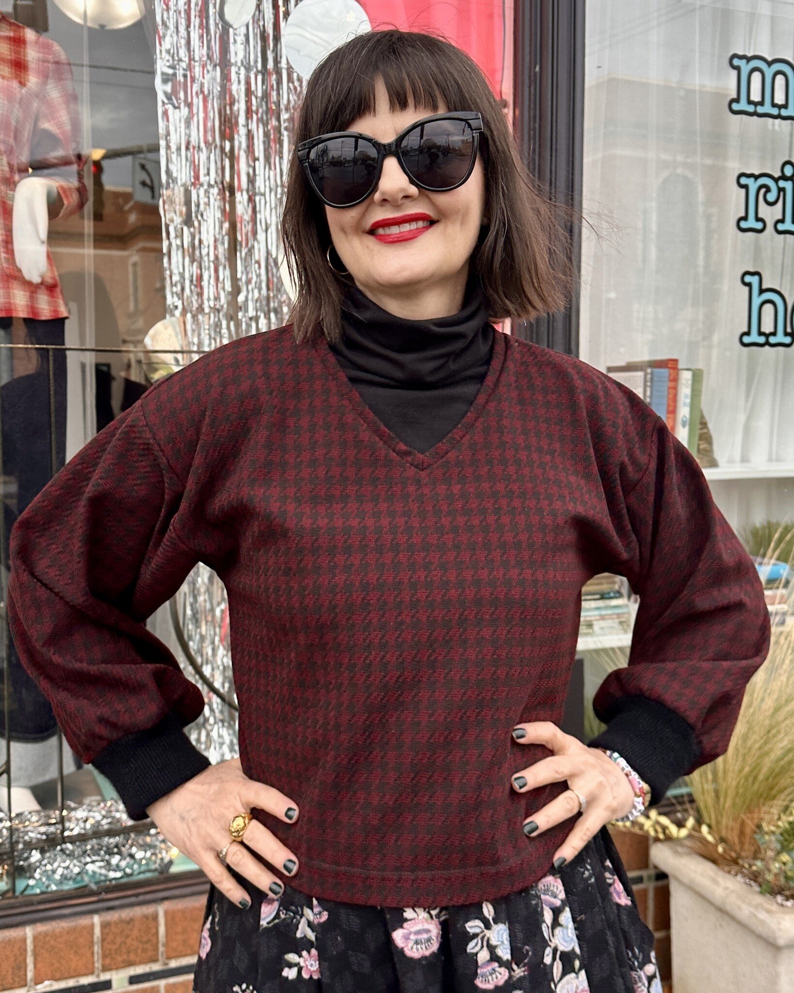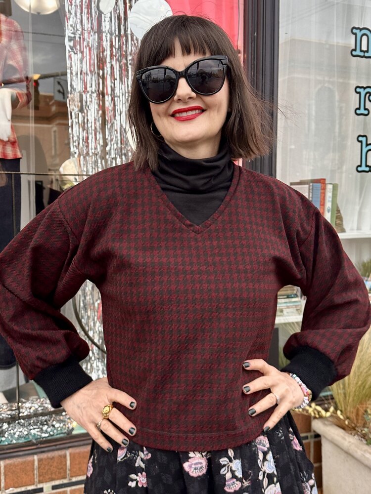 Boxy goodness with slightly drop shoulder, wide cuff and v-neck & a little cropped.