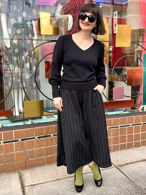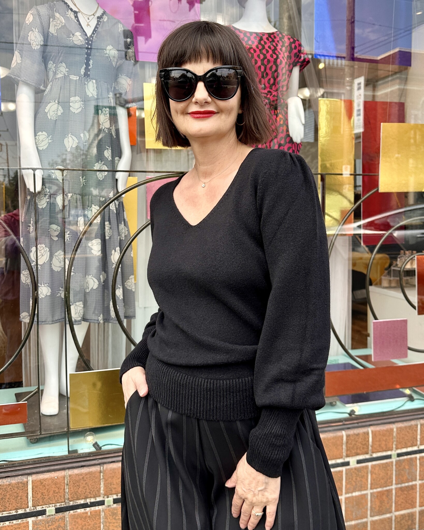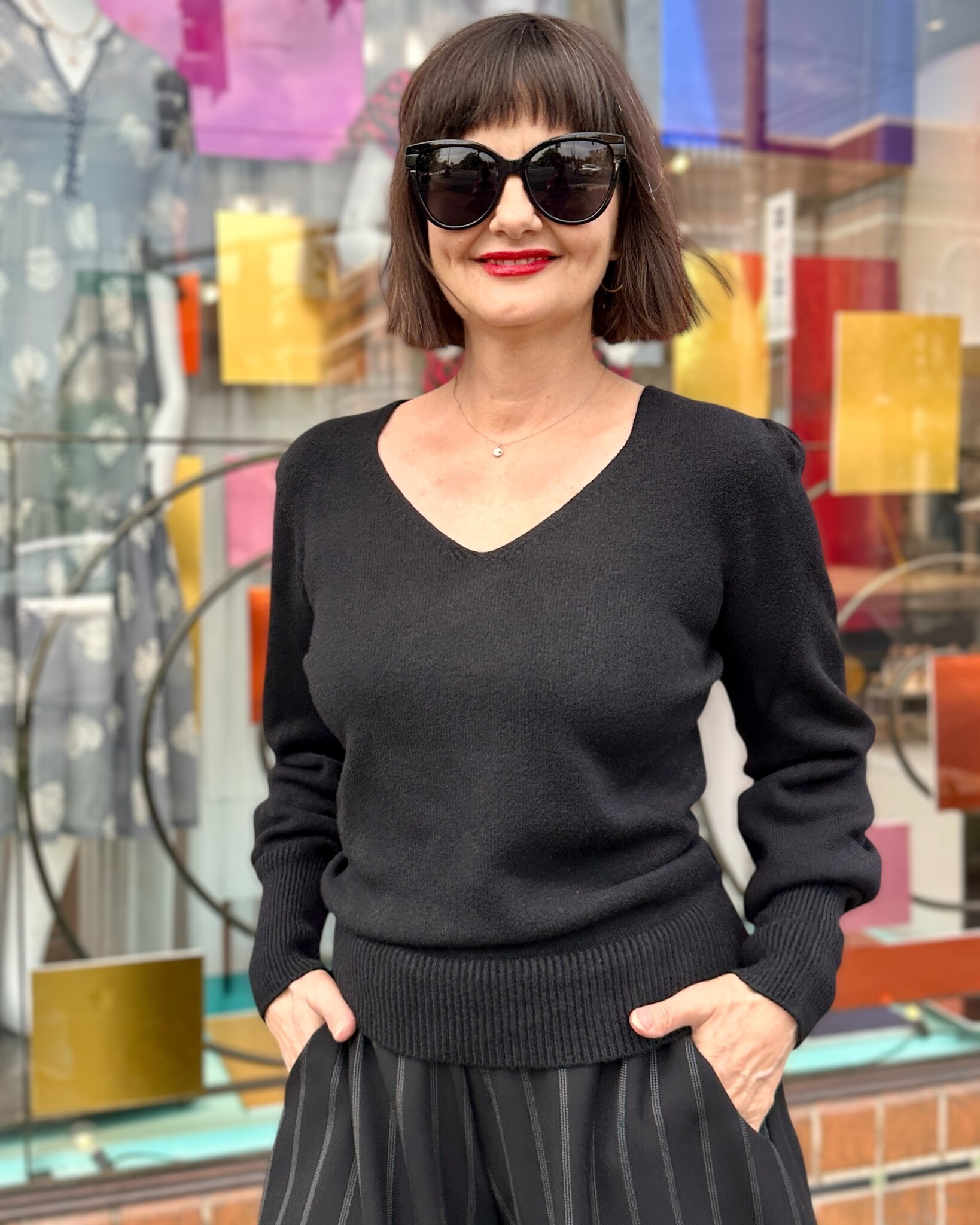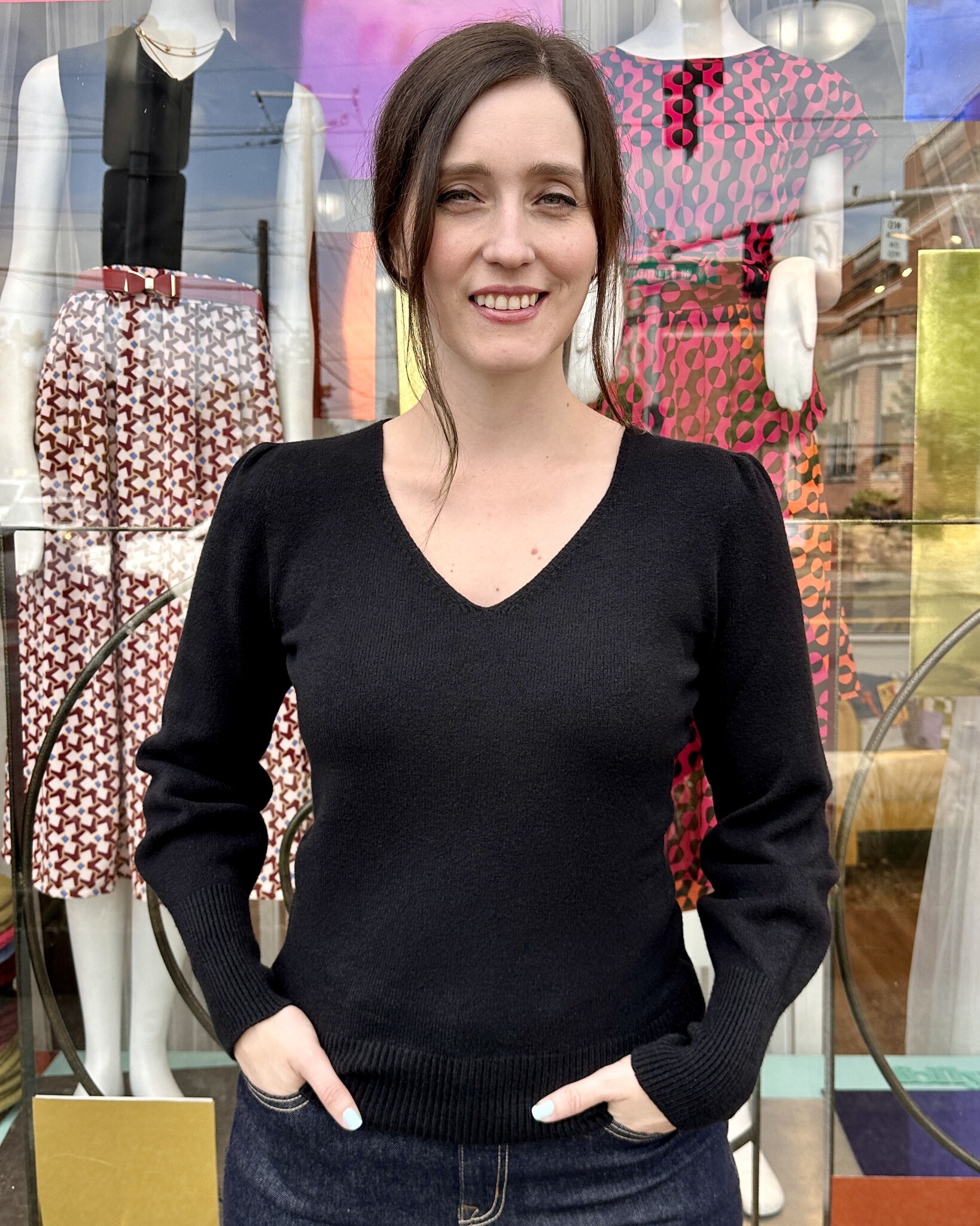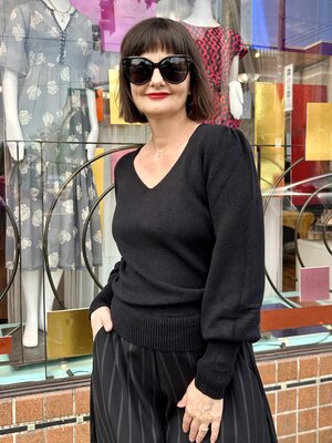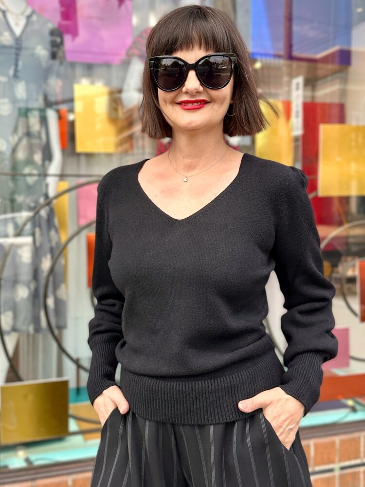 Super soft and cozy V-neck sweater with wide cuffs and just a hint of a puff shoulder.