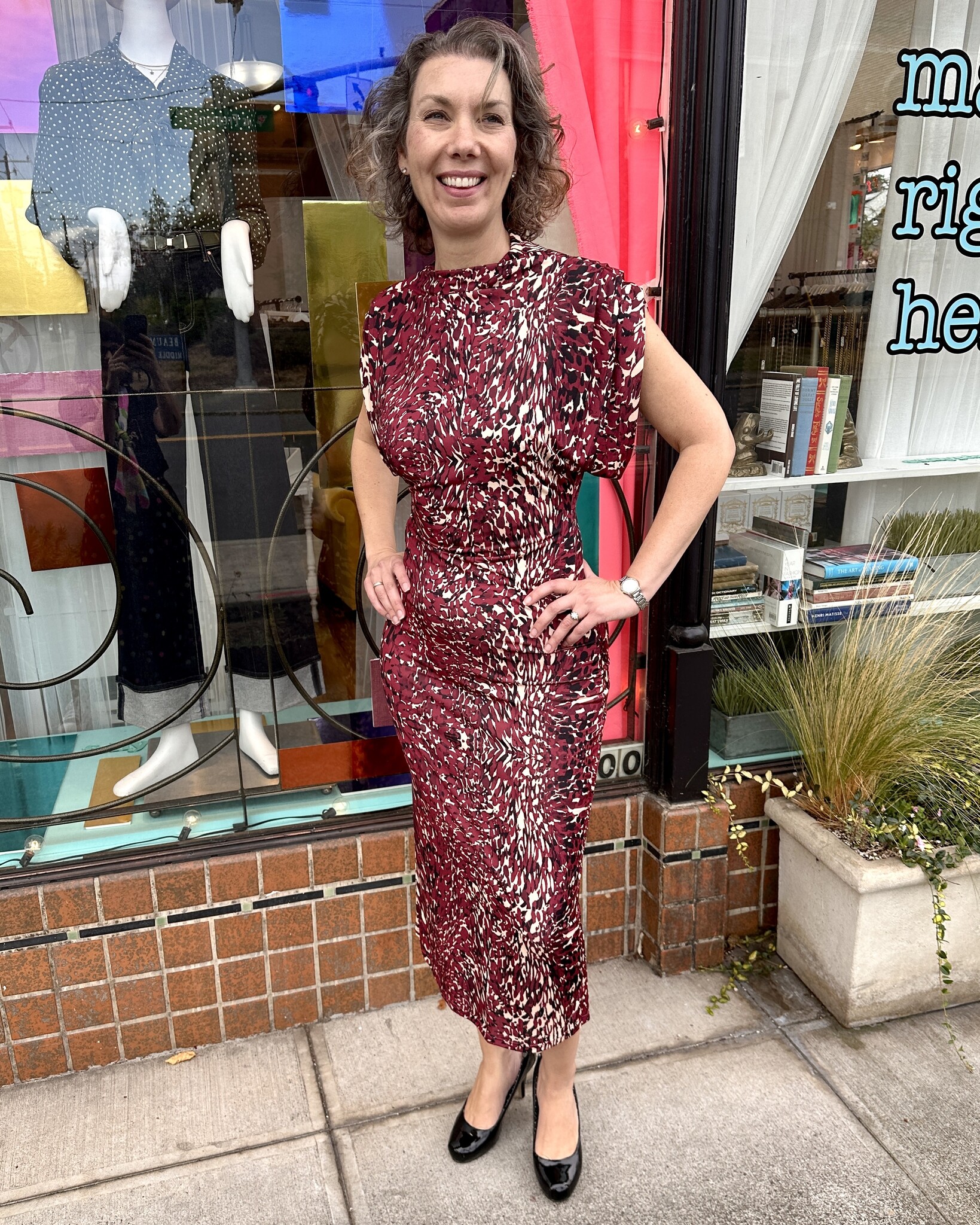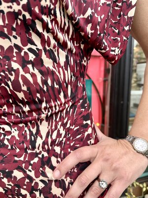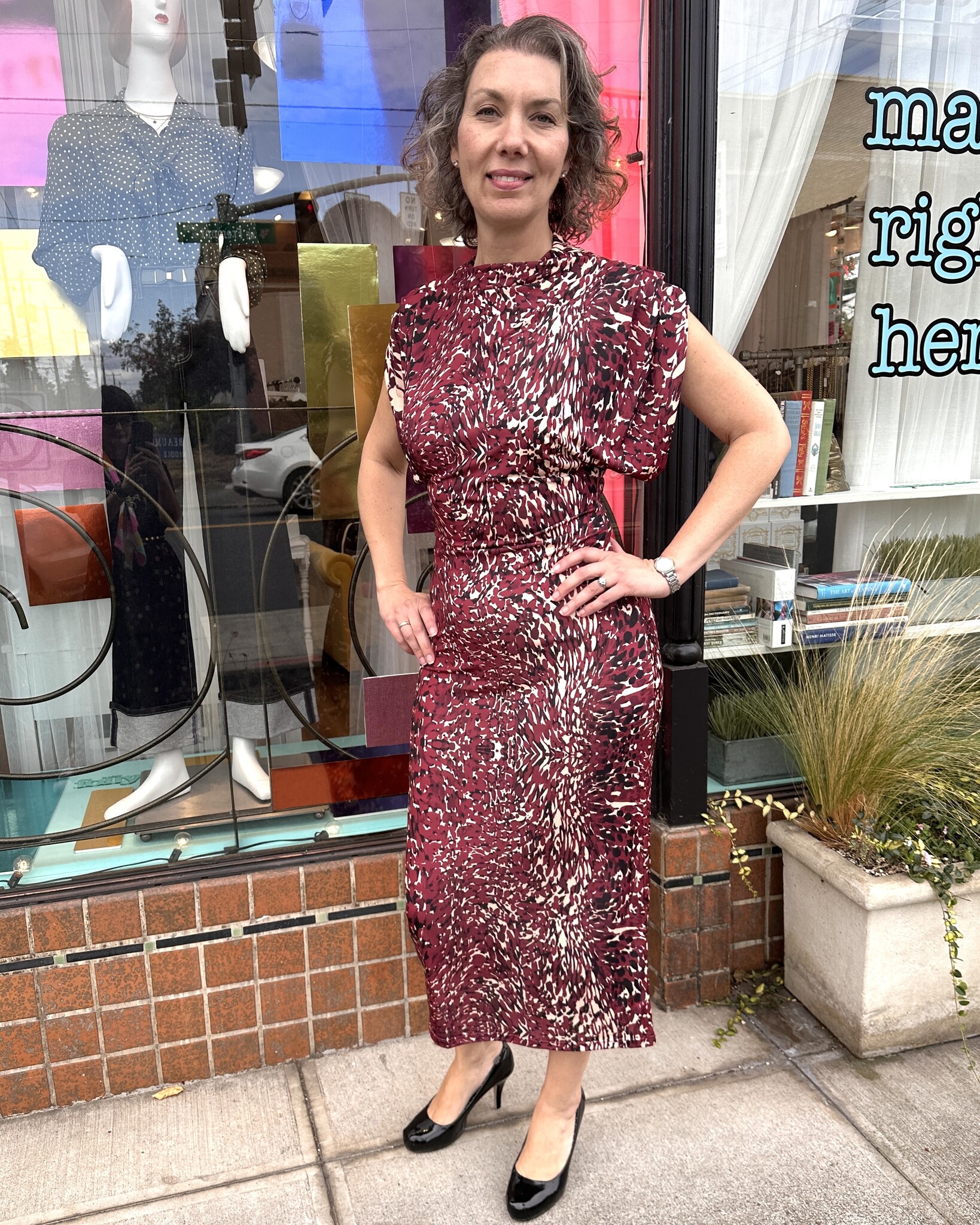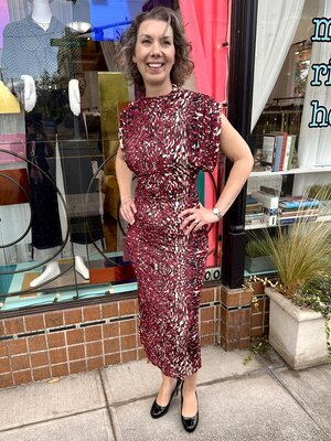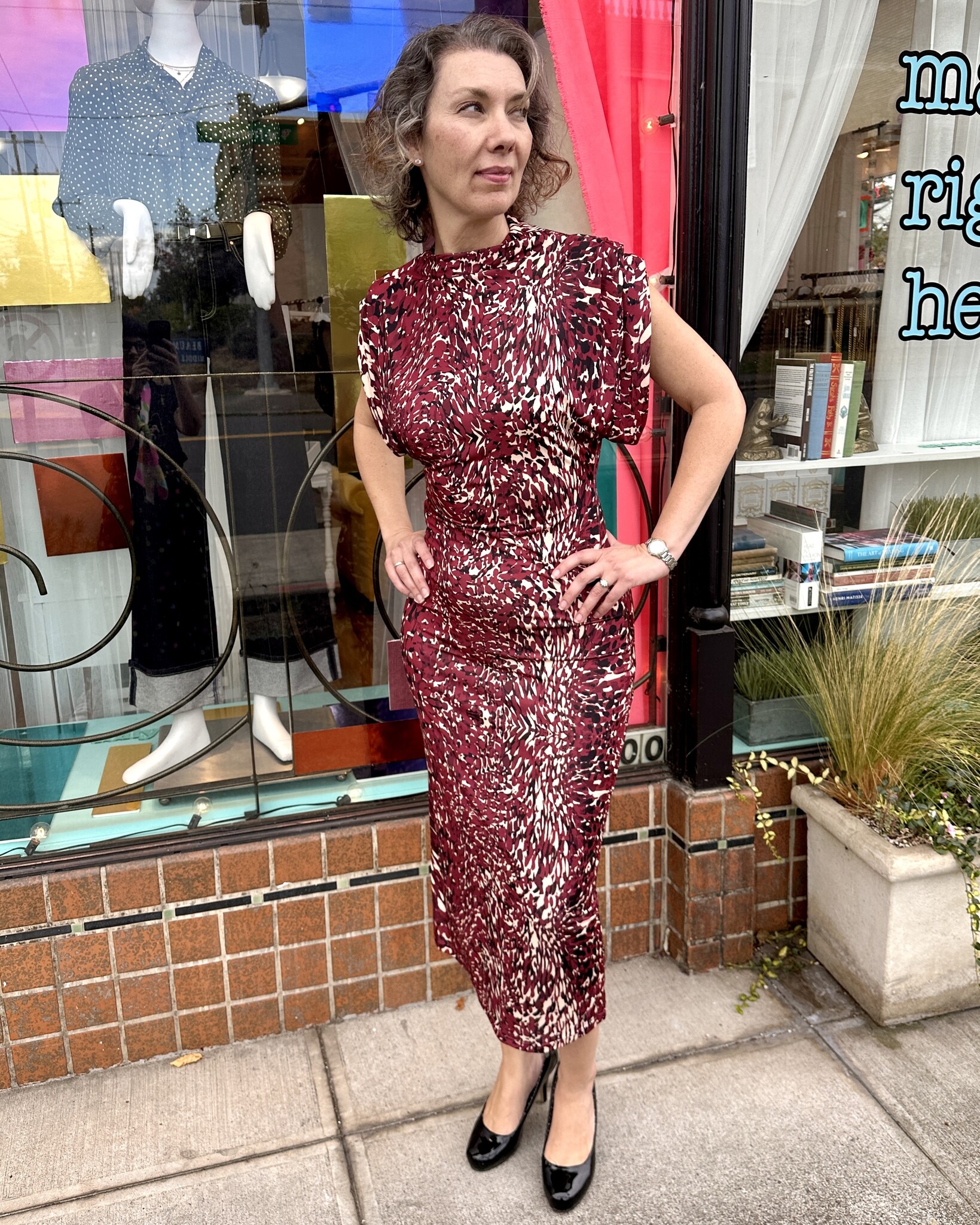 Gorgeous, slinky long dress with drama sleeves and high neck .