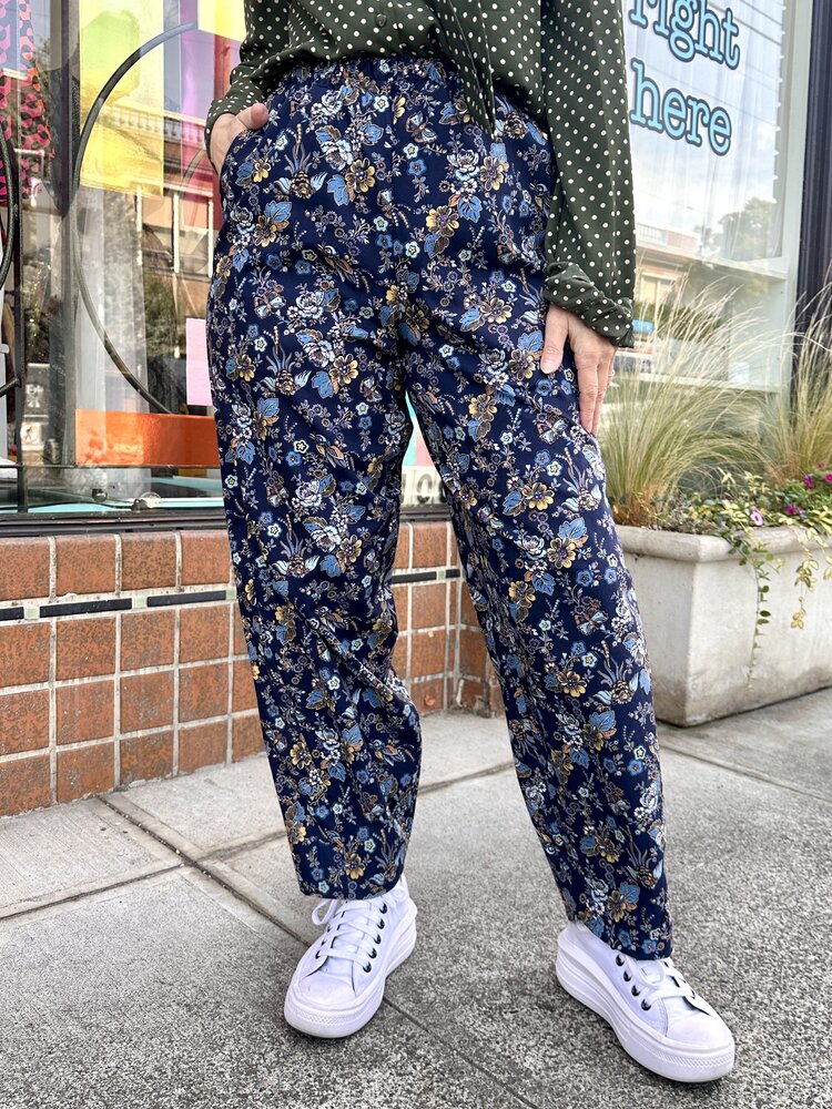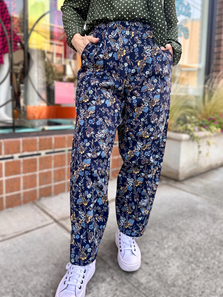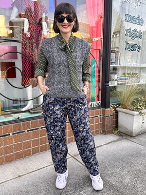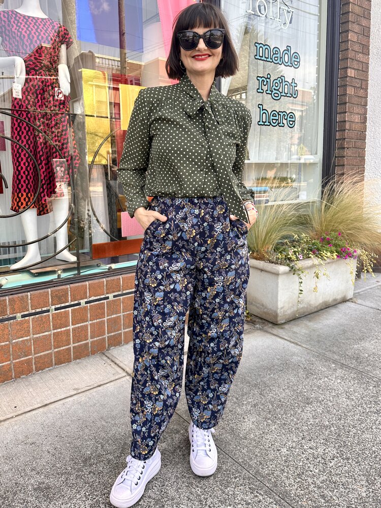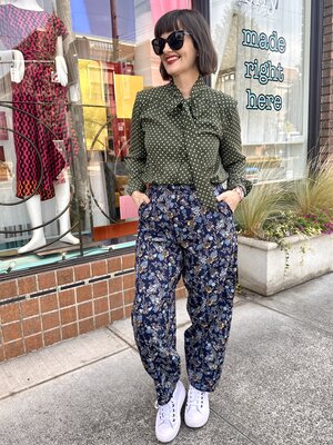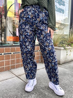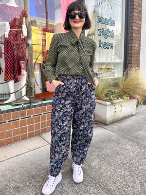 Twisted seam gives them the cool dungaree shape, pockets and elastic waist, these pants are CUTE for work or play.