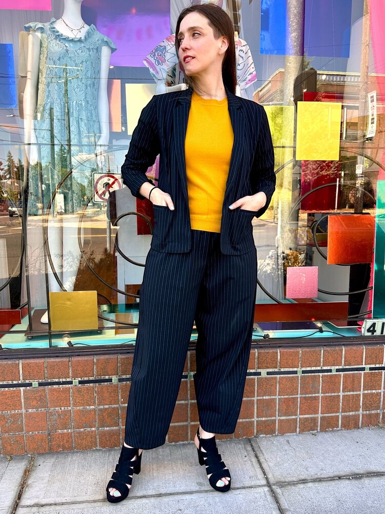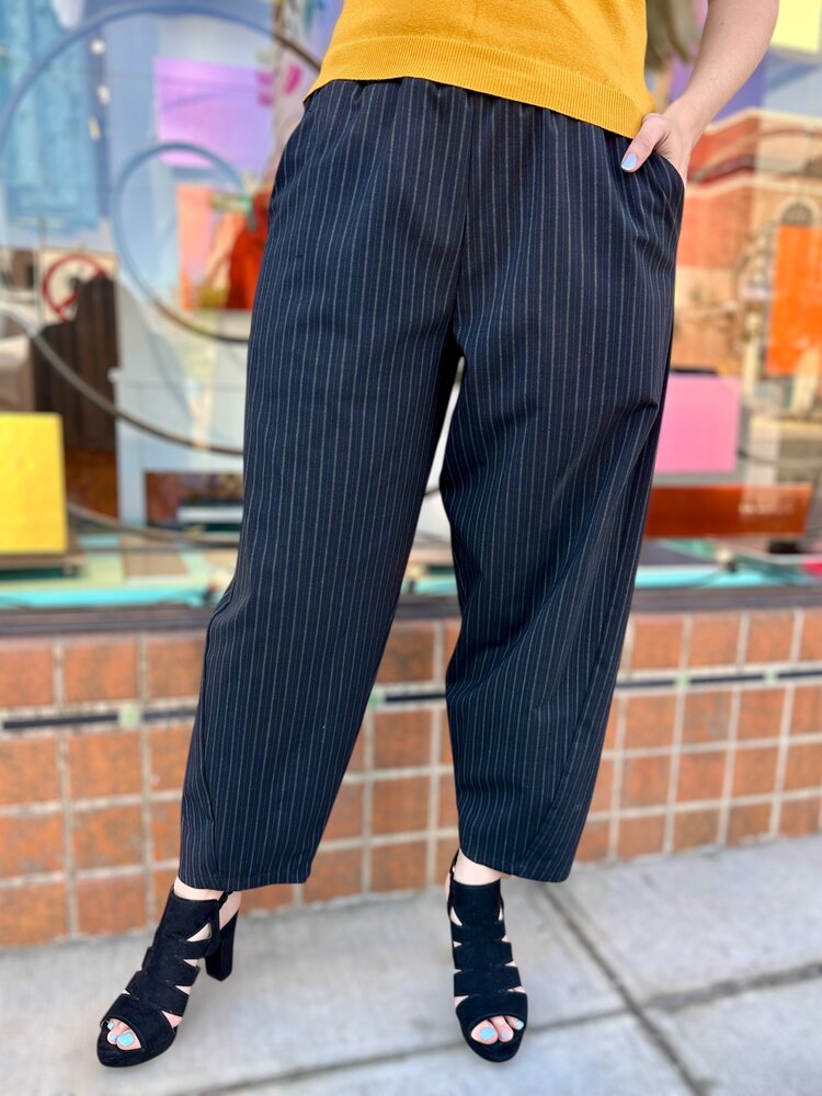 Twisted seam gives them the cool dungaree shape, simple pleats, pockets and elastic waist, these pants are CUTE for work or play.