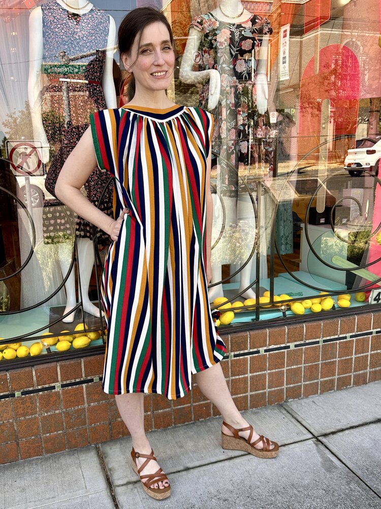 Gathered boat neck, loosey-goosey body with pockets and sash to use as you please! The Mu-Mu of your dreams turns into the cutest dress with the sash.. trust me!