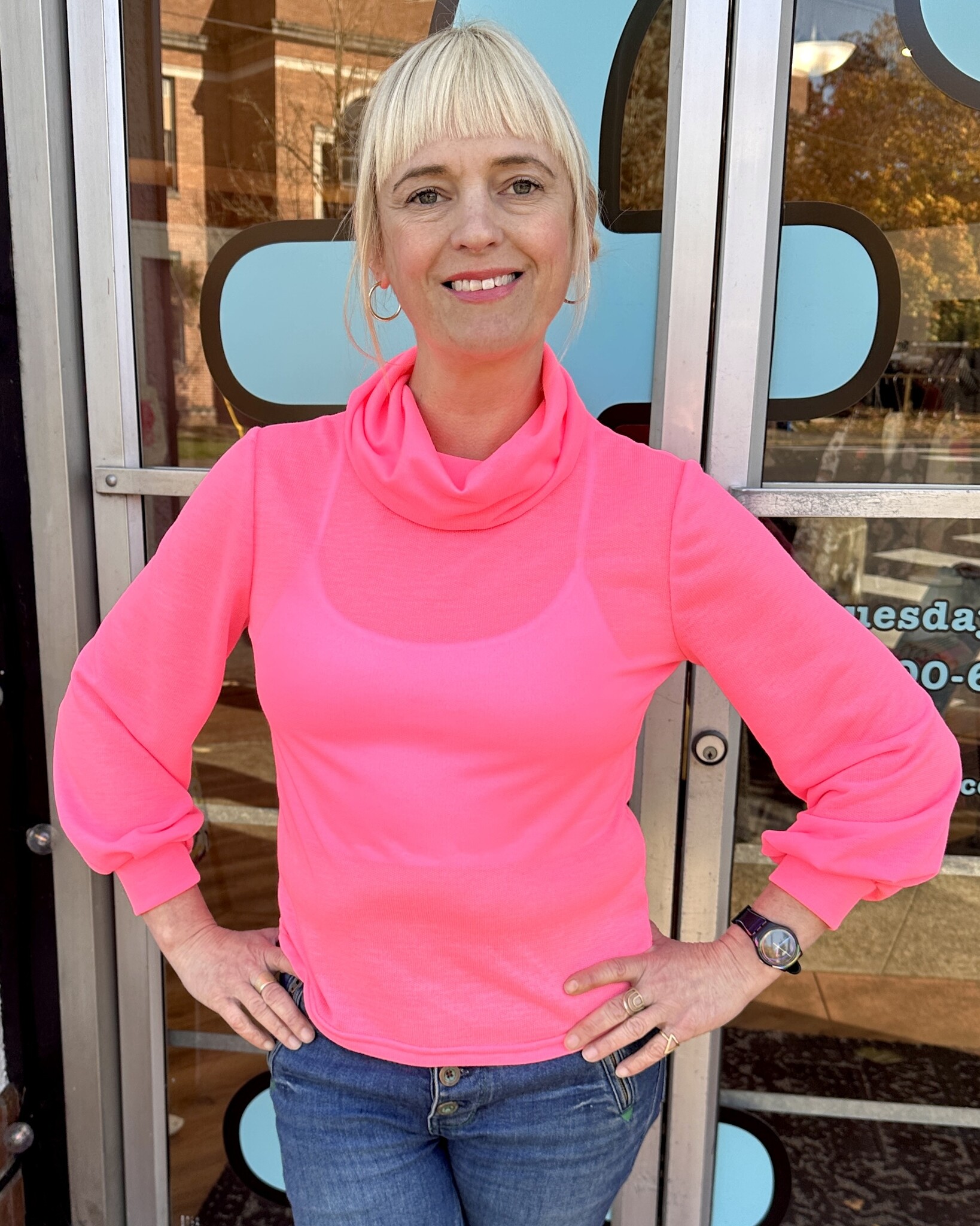 Super cozy cowl neck, long sleeve top with cuff detail.