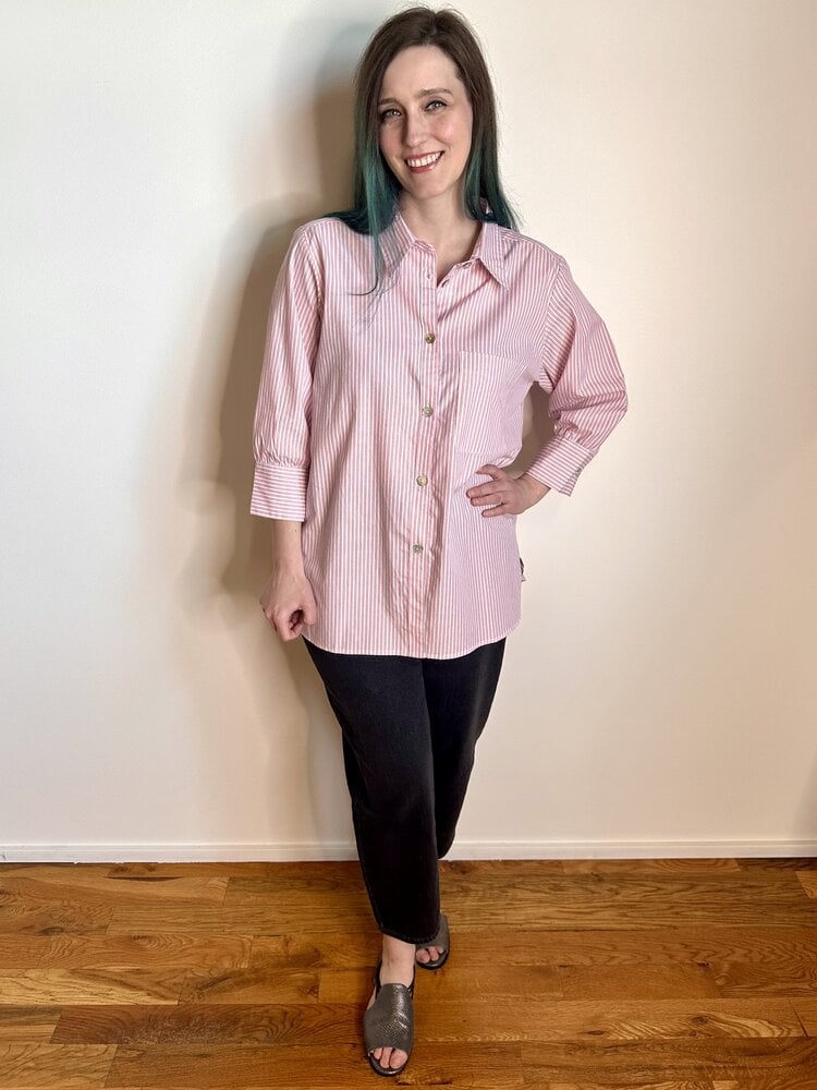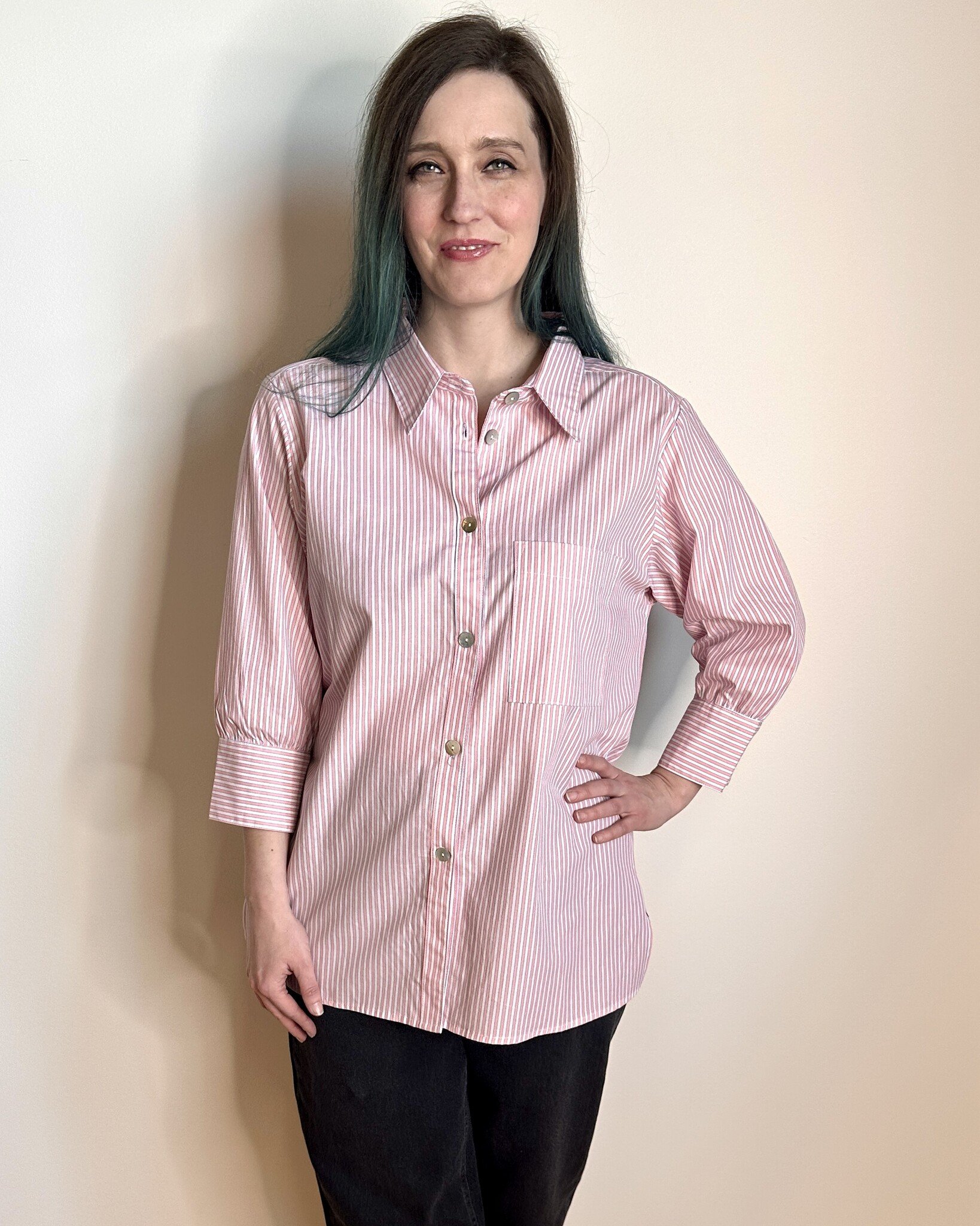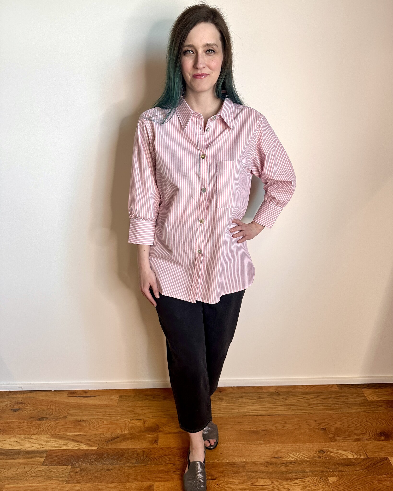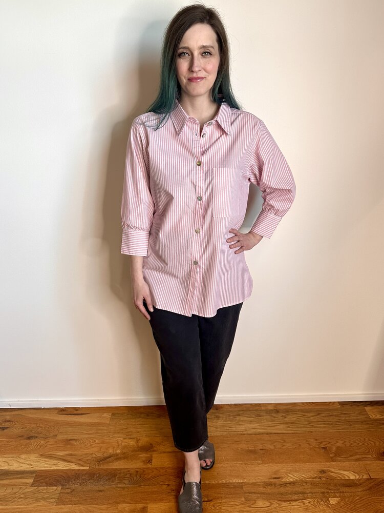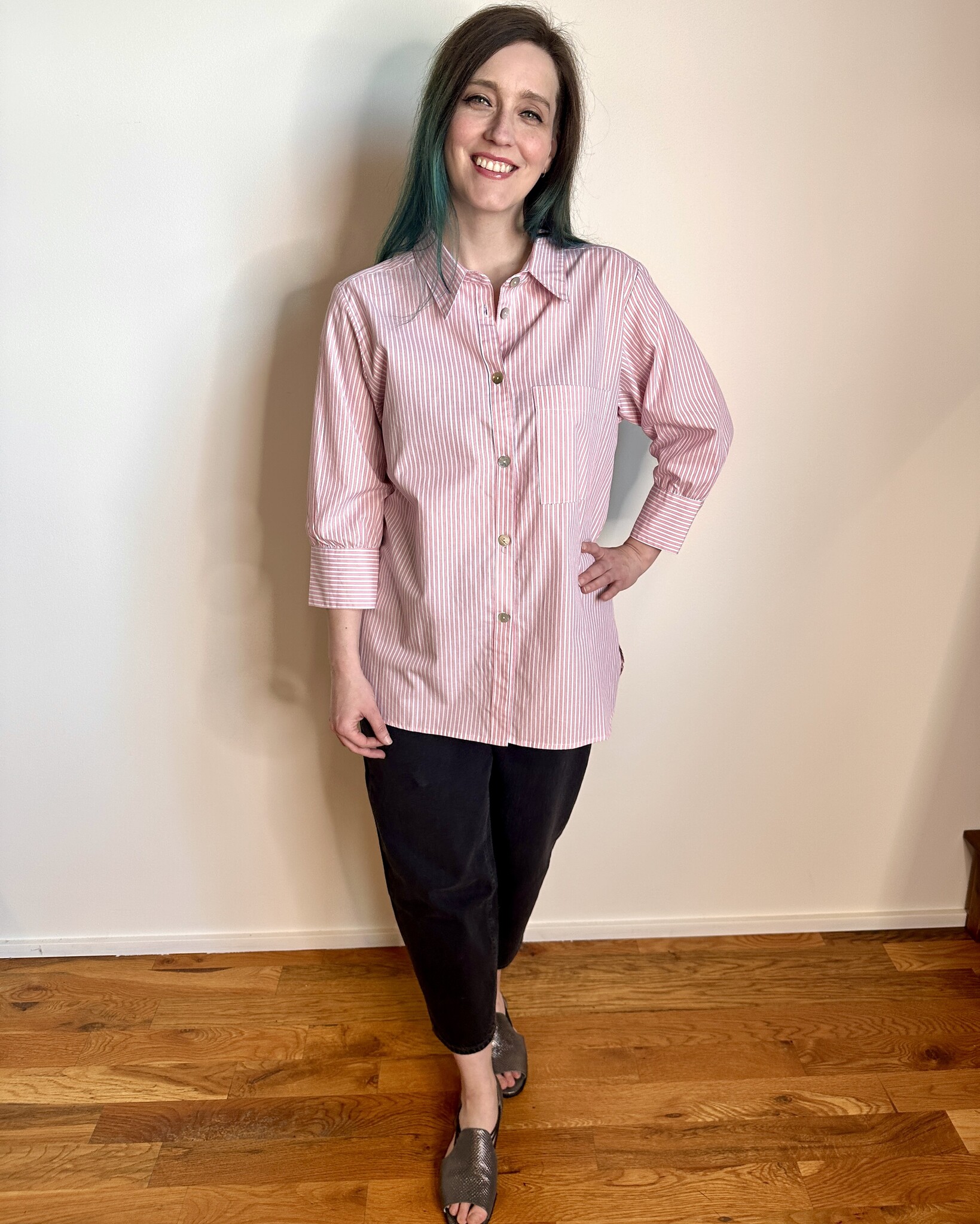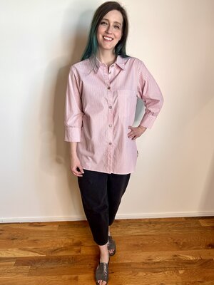 Relaxed classic style! Love this oxford blouse from Cameo. Classic with updated details like 3/4 sleeve and longer length. You will love this look with your favorite slim pants.
