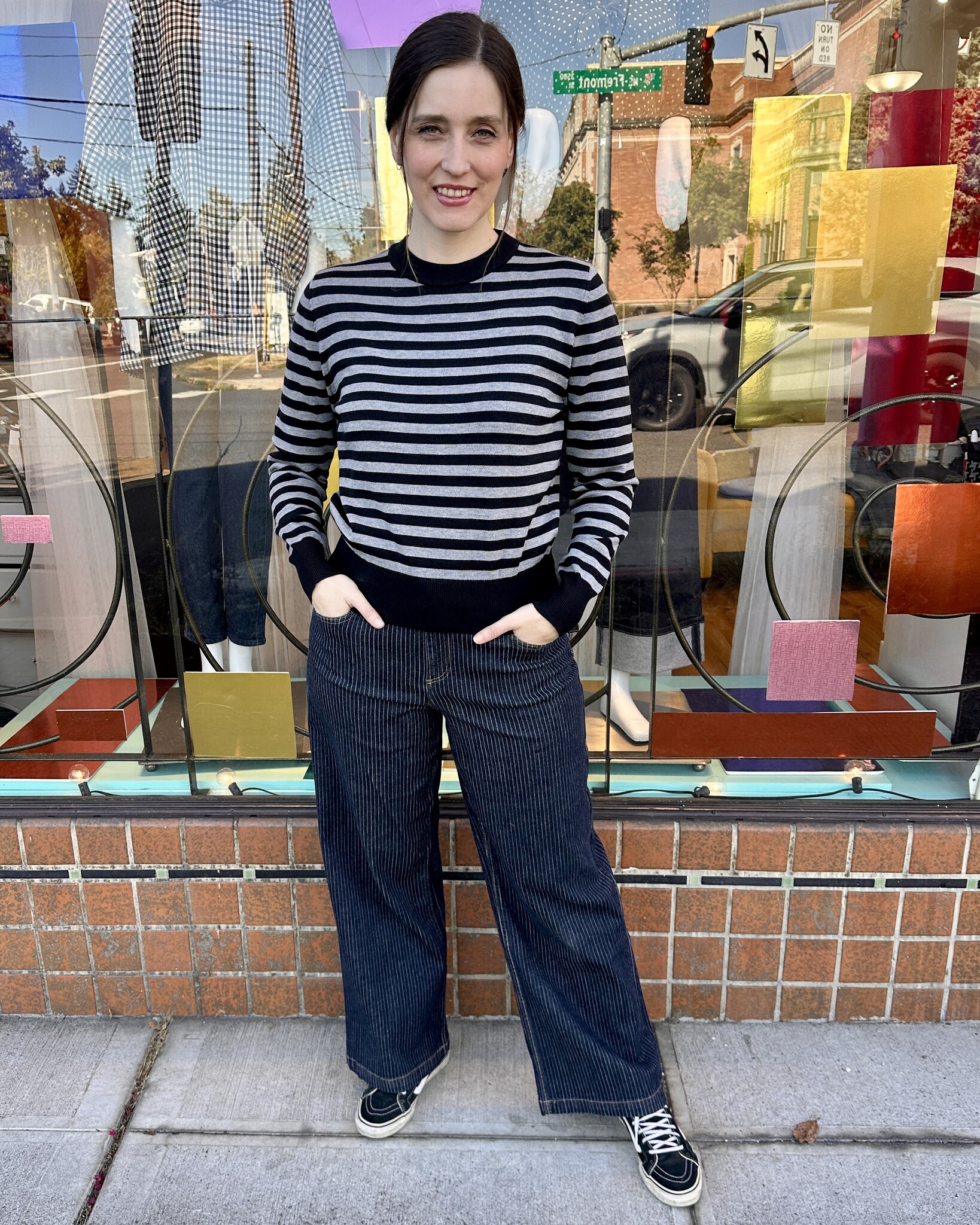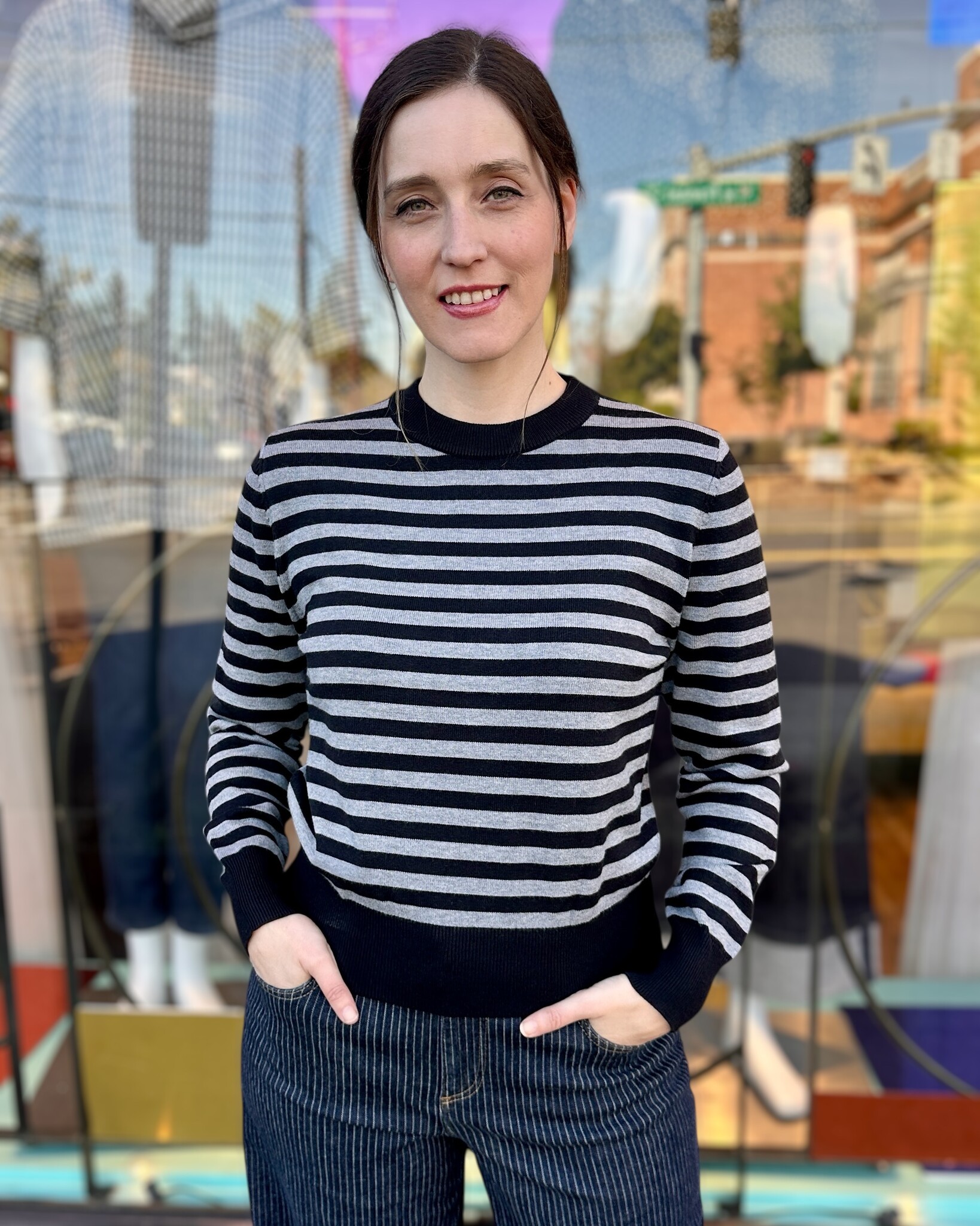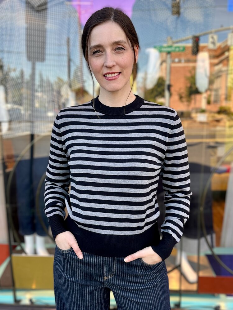 Cute black and grey striped sweater.