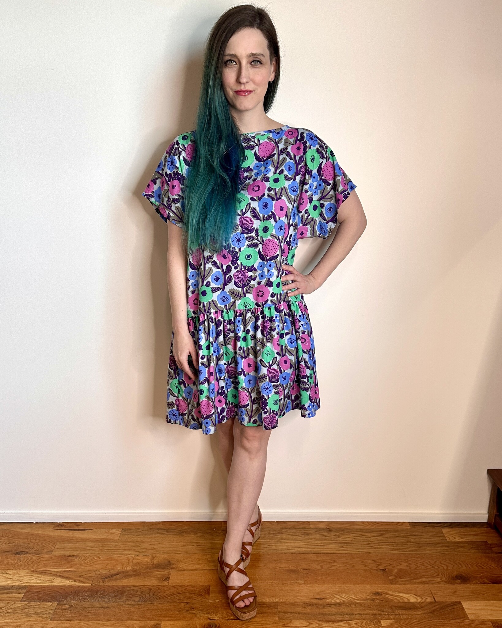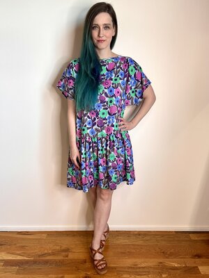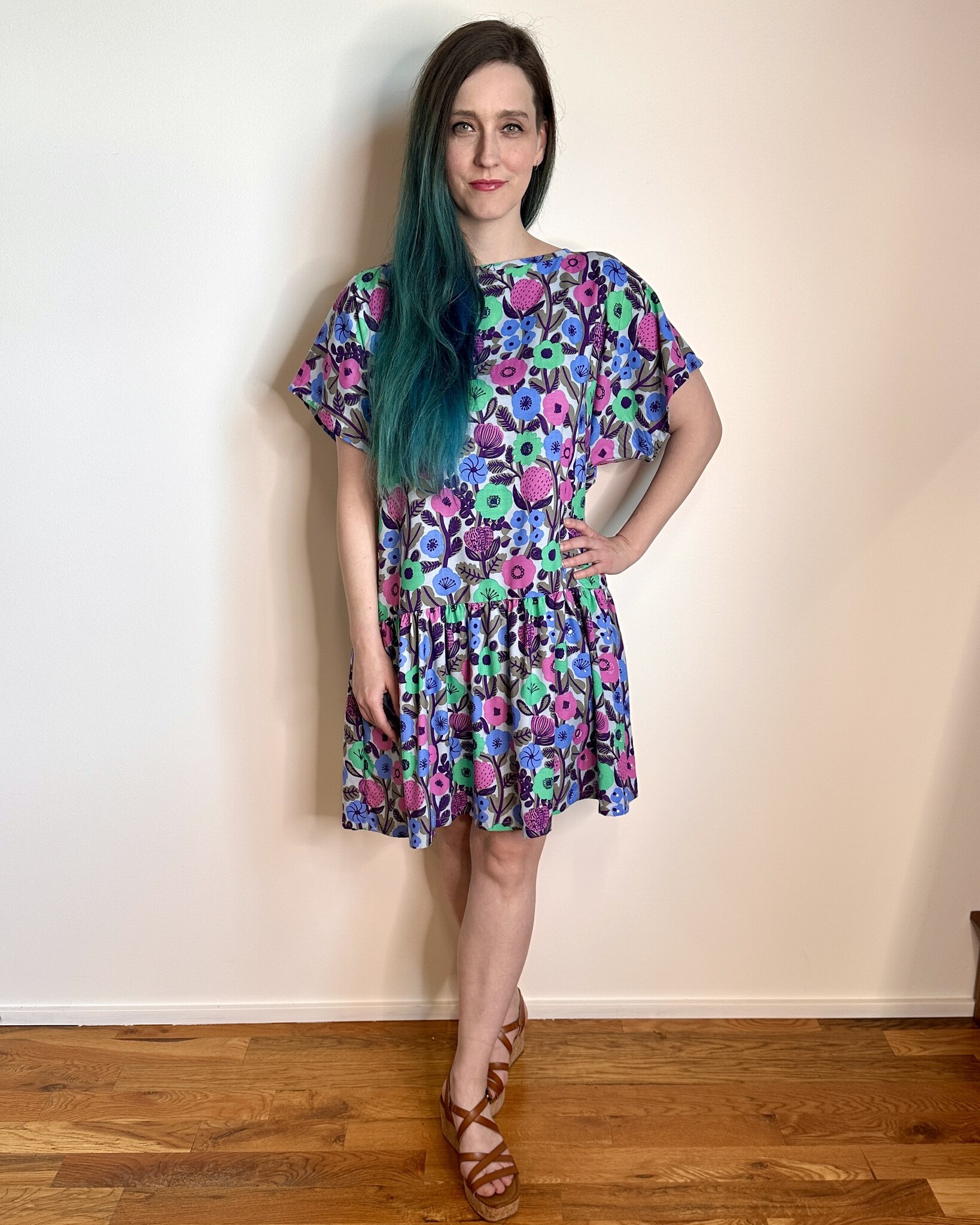 Paulie is a loose-n-easy dress with a drop waist, ruffle, and wide neck.