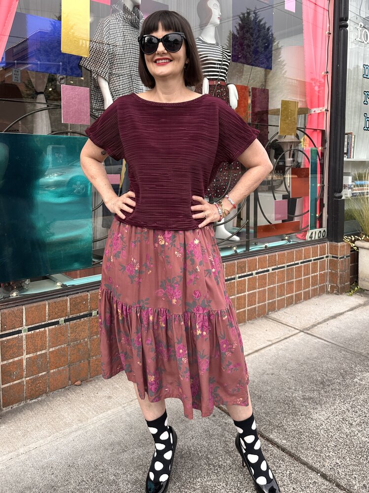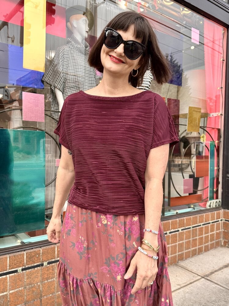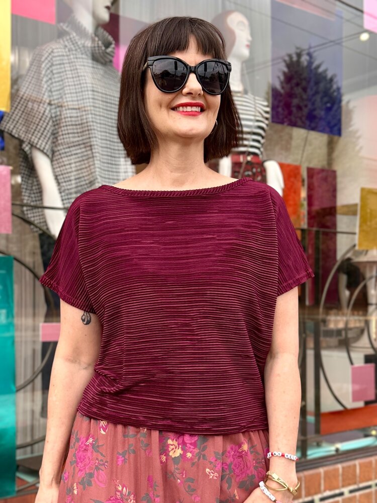 Gorgeous wine colored top! The Rita is our favorite light layer.