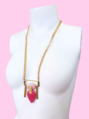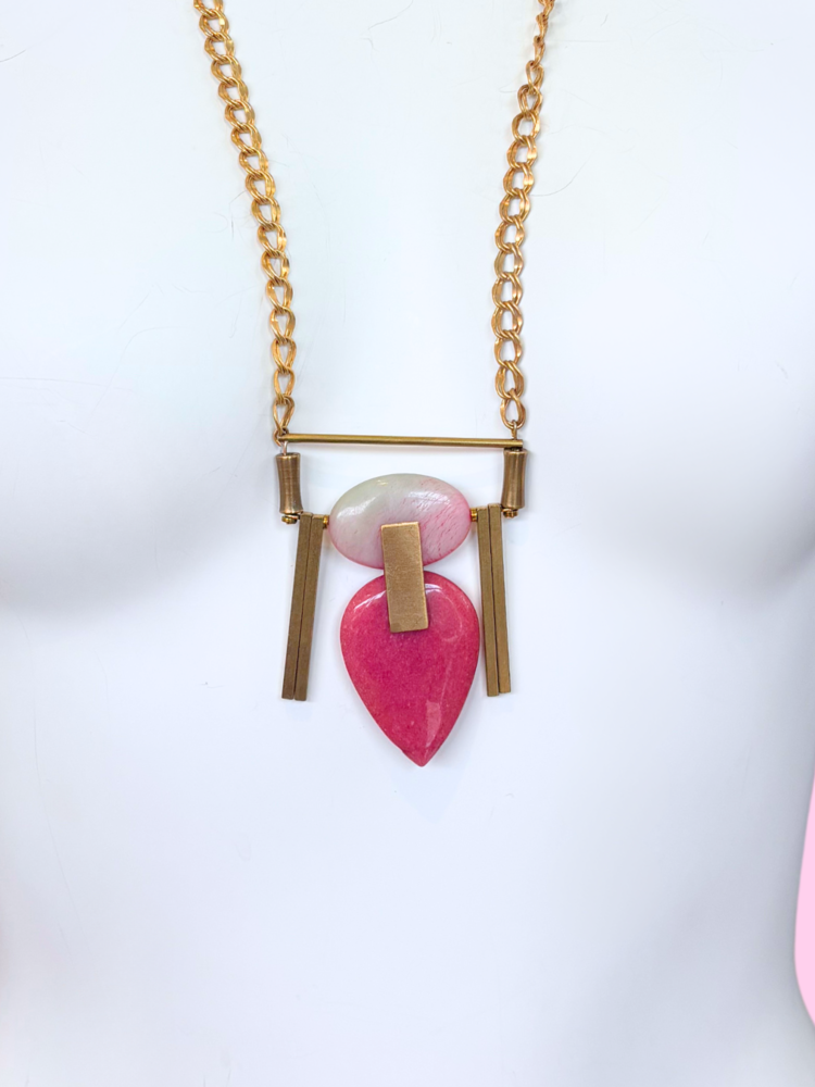 B-E-A-utifull long golden necklace with pink stones and brass accents.