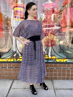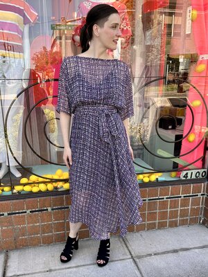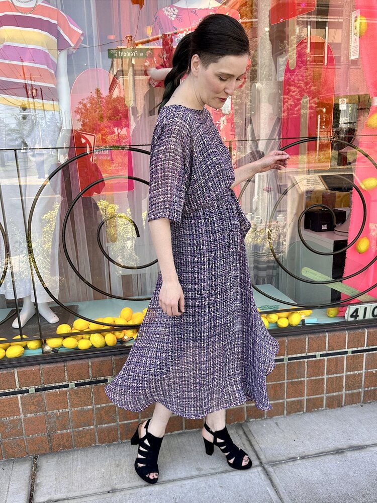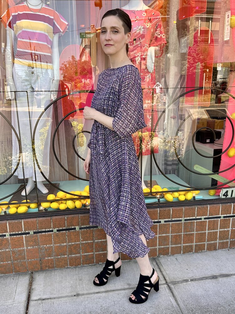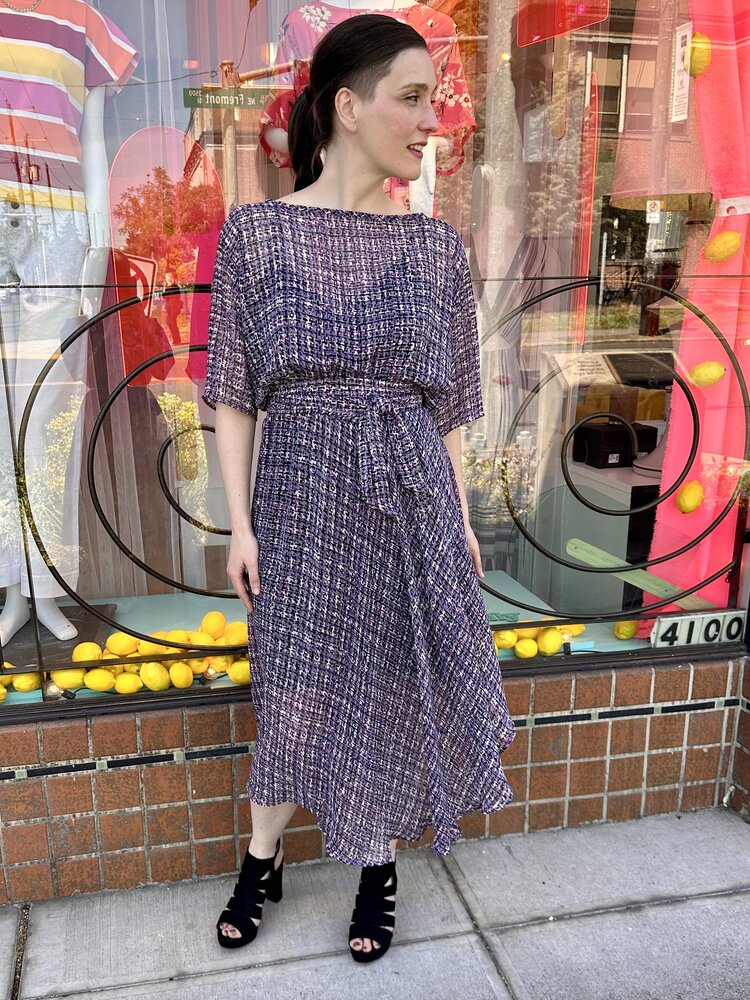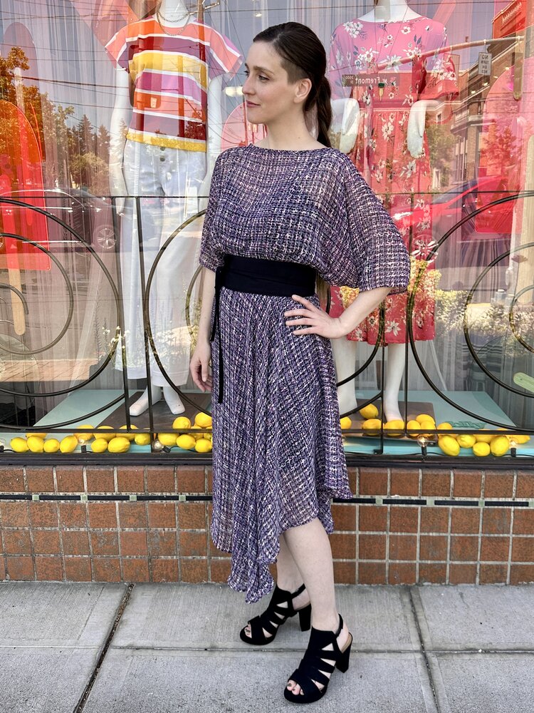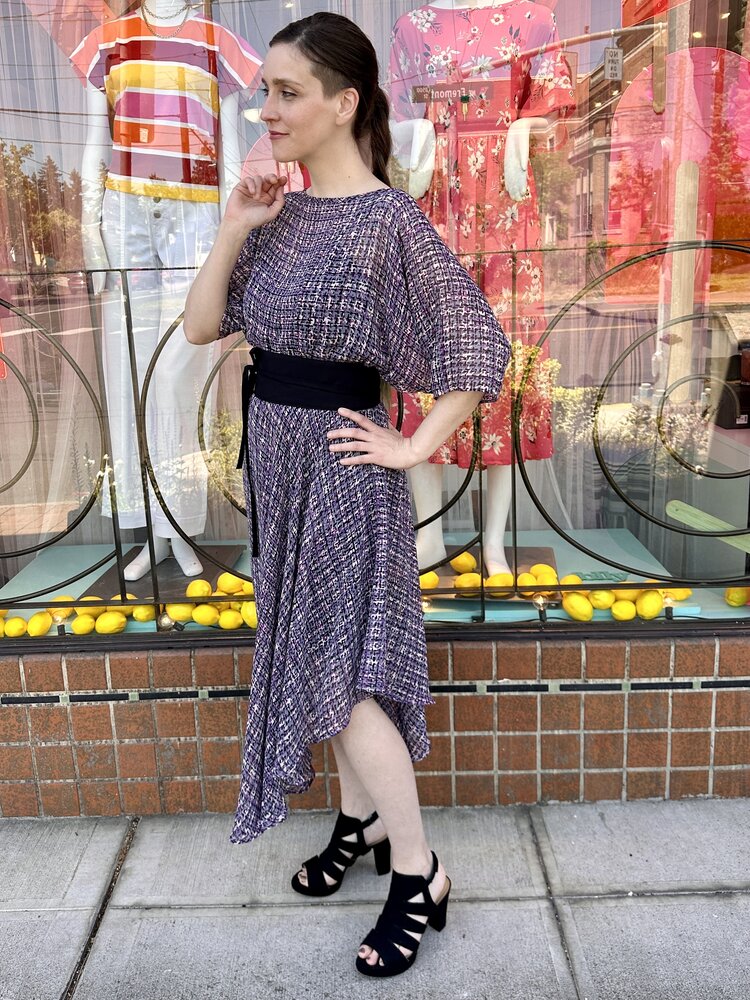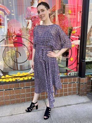 The original Sarah Dress is a perfect blend of all the things you love about the Sarah Bibb clothing line. This asymmetrical skirt flutters when you walk and easy dolman sleeve is a one size marvel!