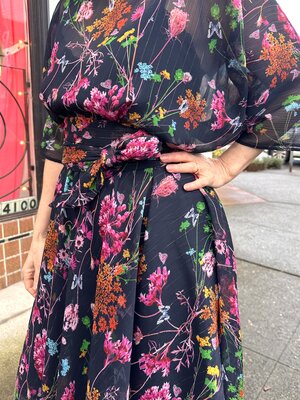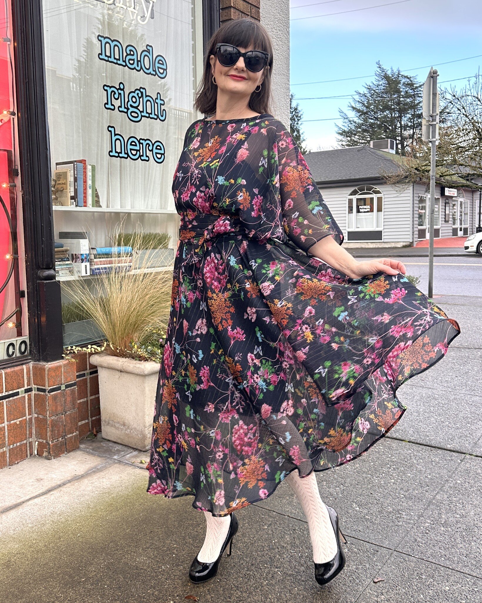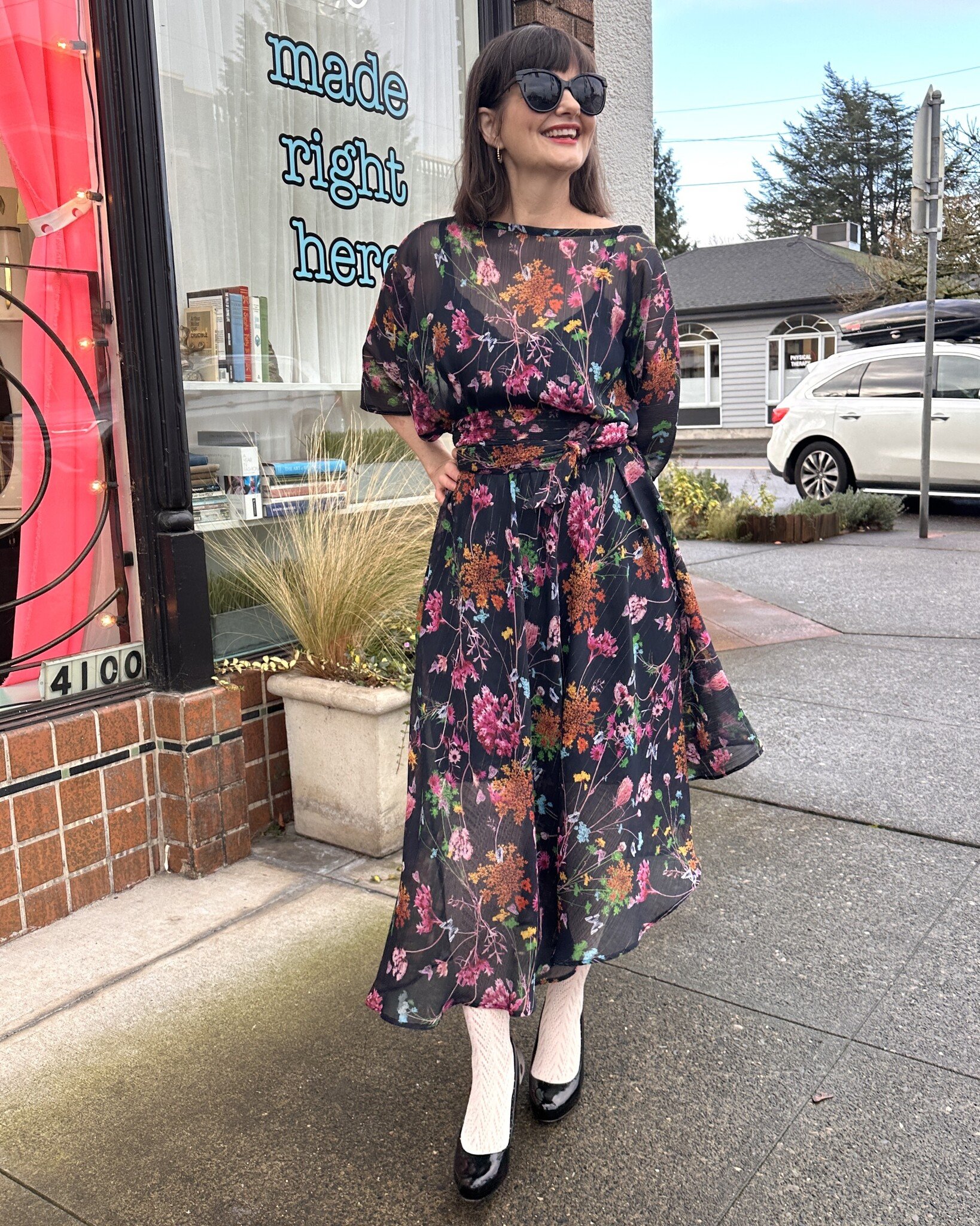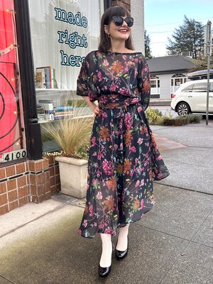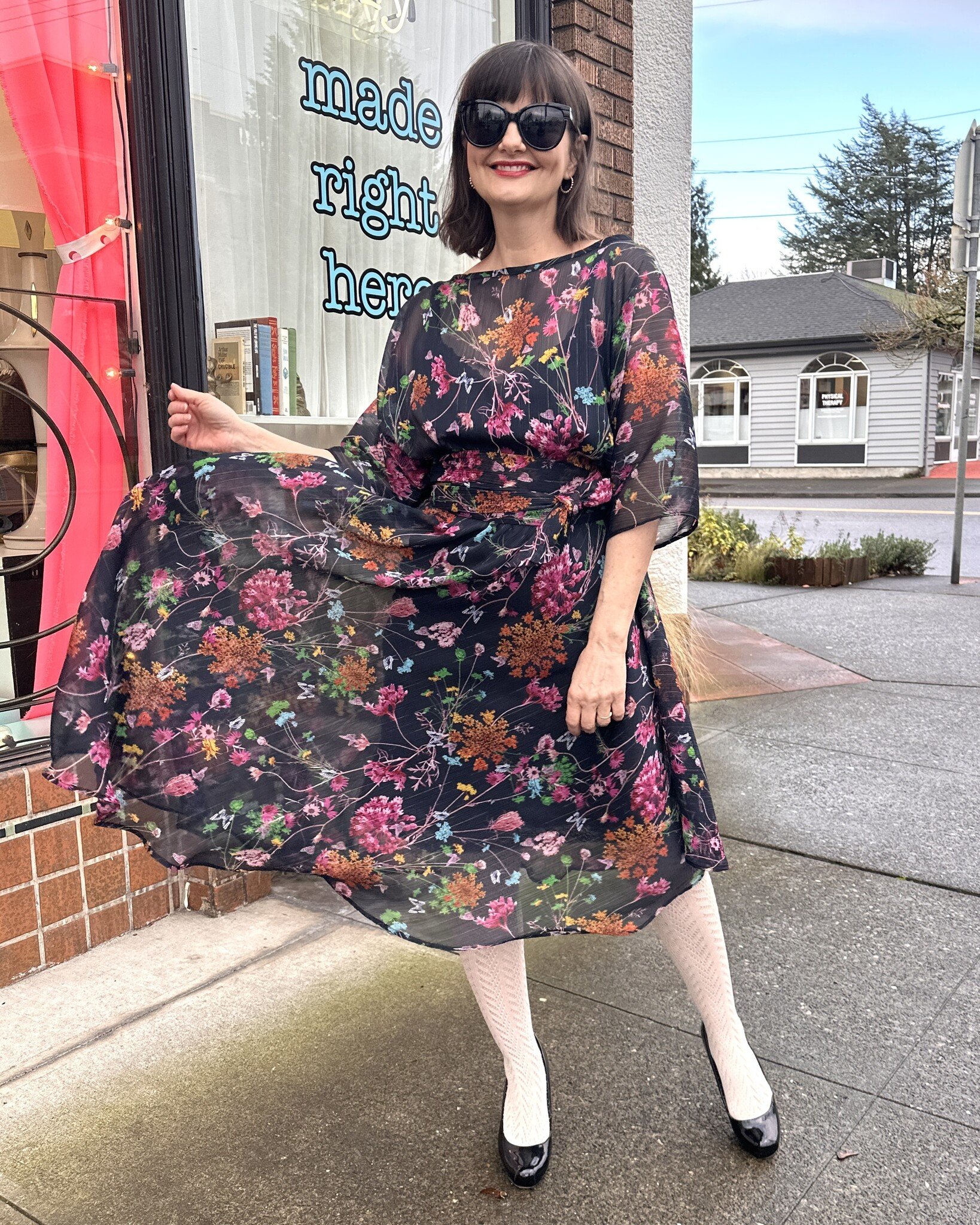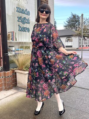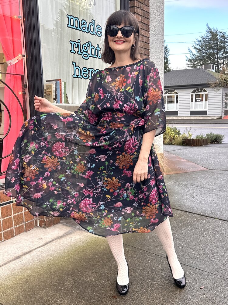 The original Sarah Dress is a perfect blend of all the things you love about the Sarah Bibb clothing line. This asymmetrical skirt flutters when you walk and easy dolman sleeve is a one size marvel!
