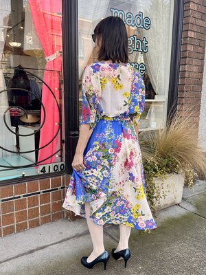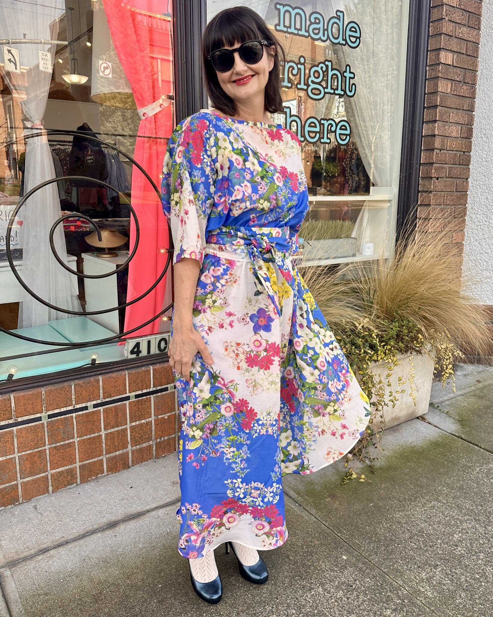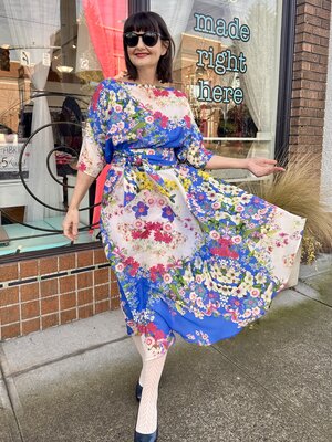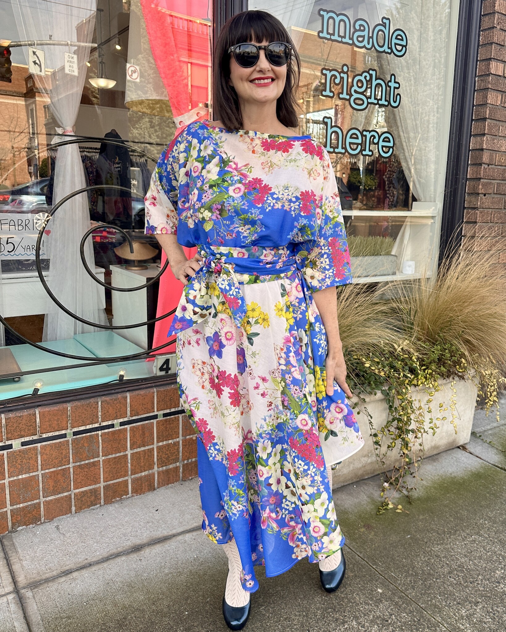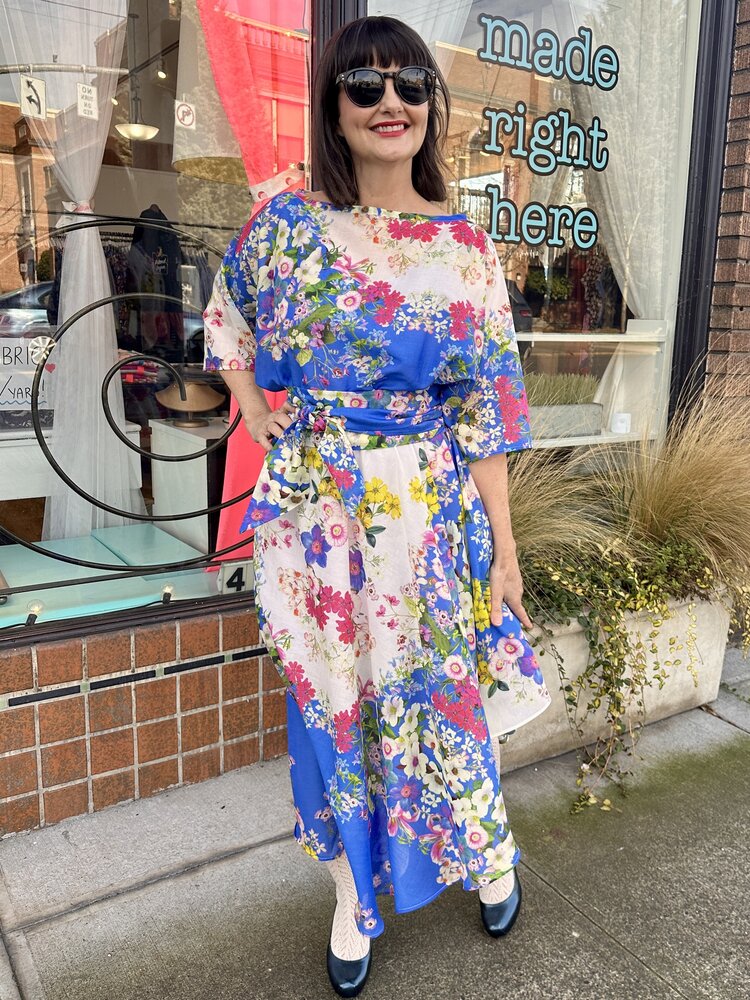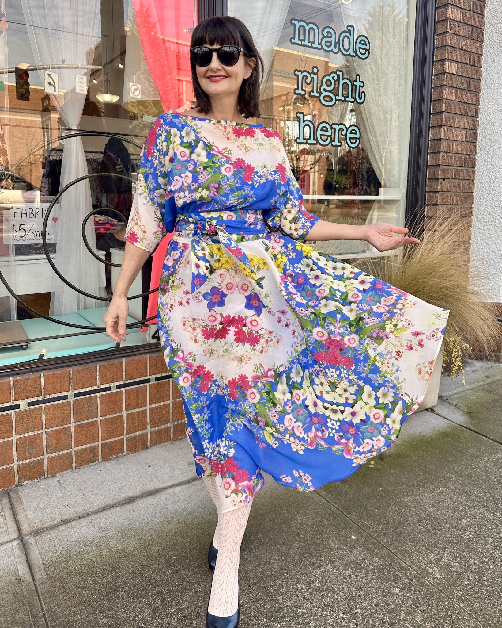 The original Sarah Dress is a perfect blend of all the things you love about the Sarah Bibb clothing line. This asymmetrical skirt flutters when you walk and easy dolman sleeve is a one size marvel!