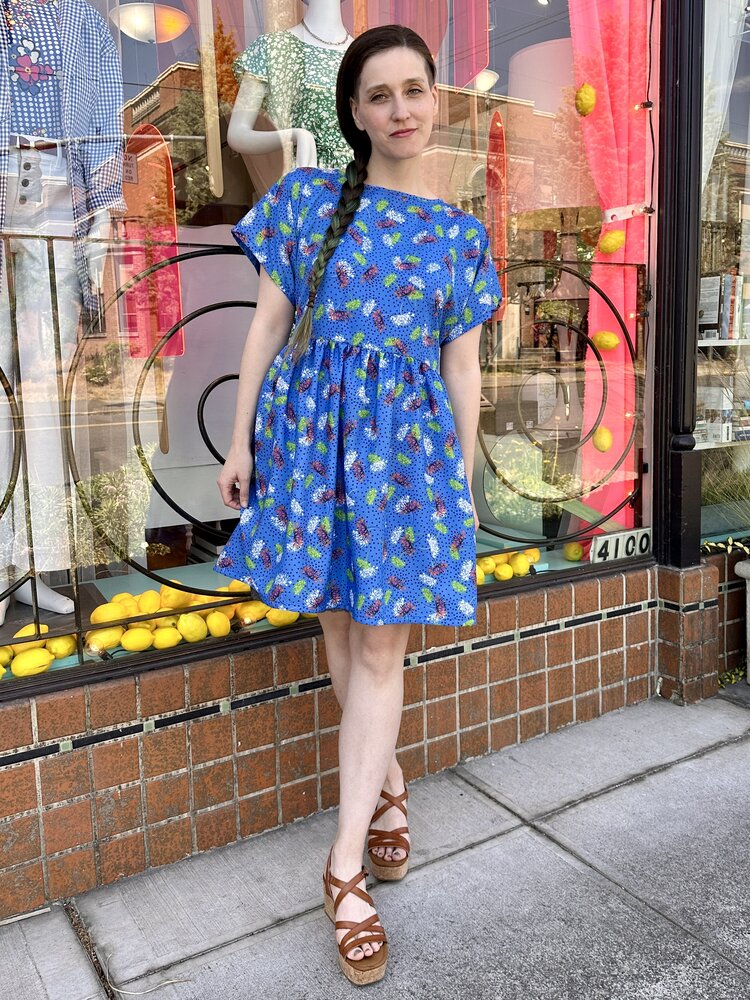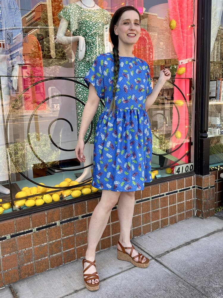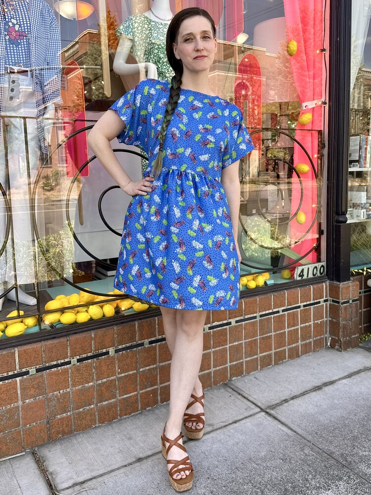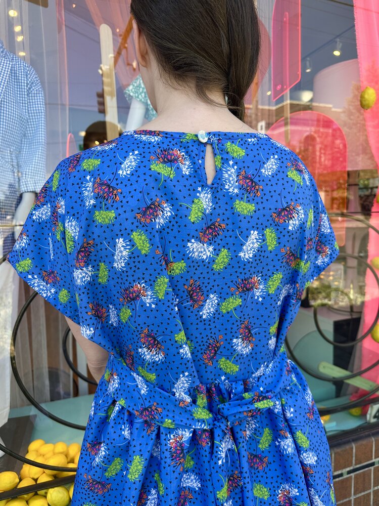 One of our shorter dresses! Above the knee, an attached belt you can tie in front or back and pockets!