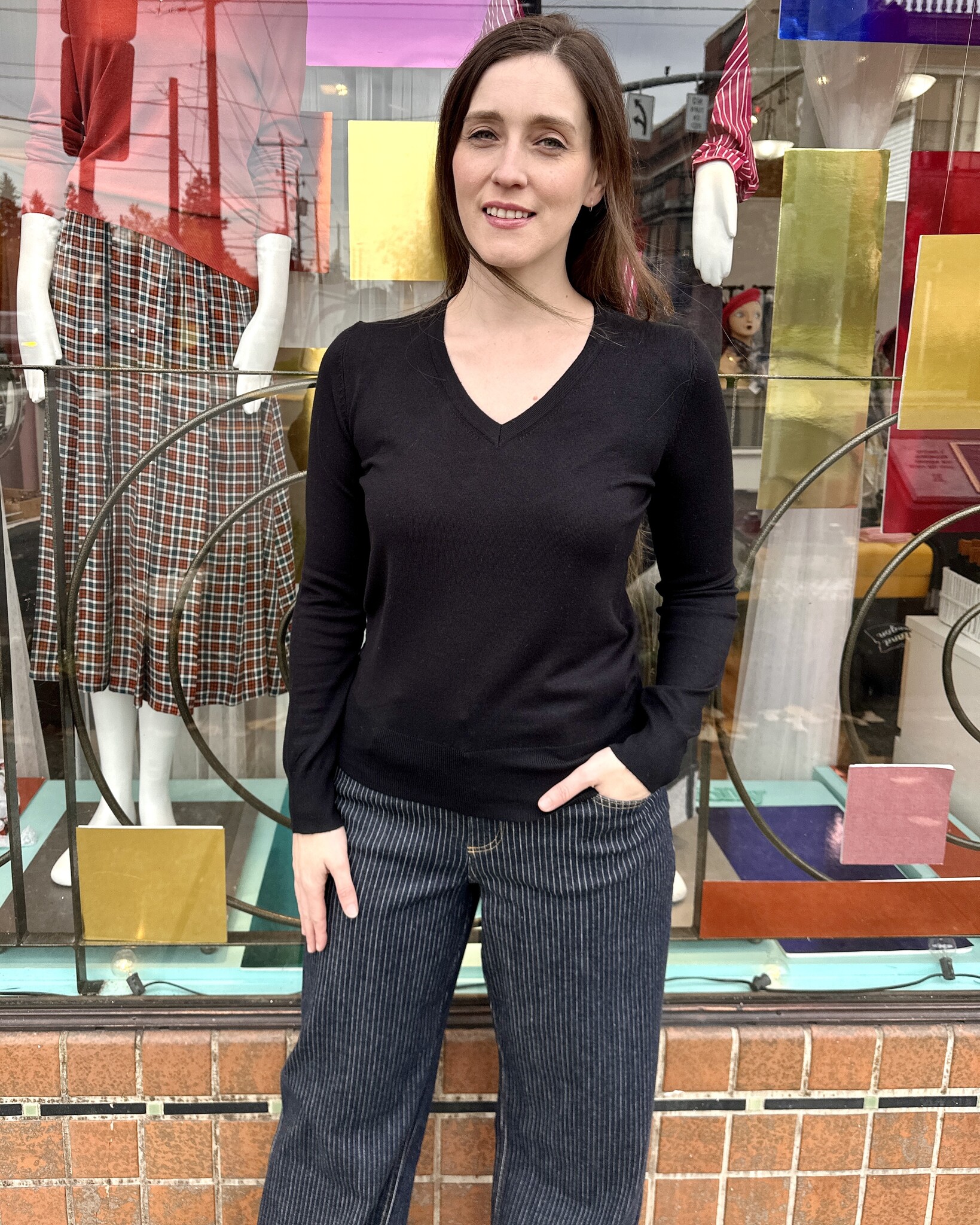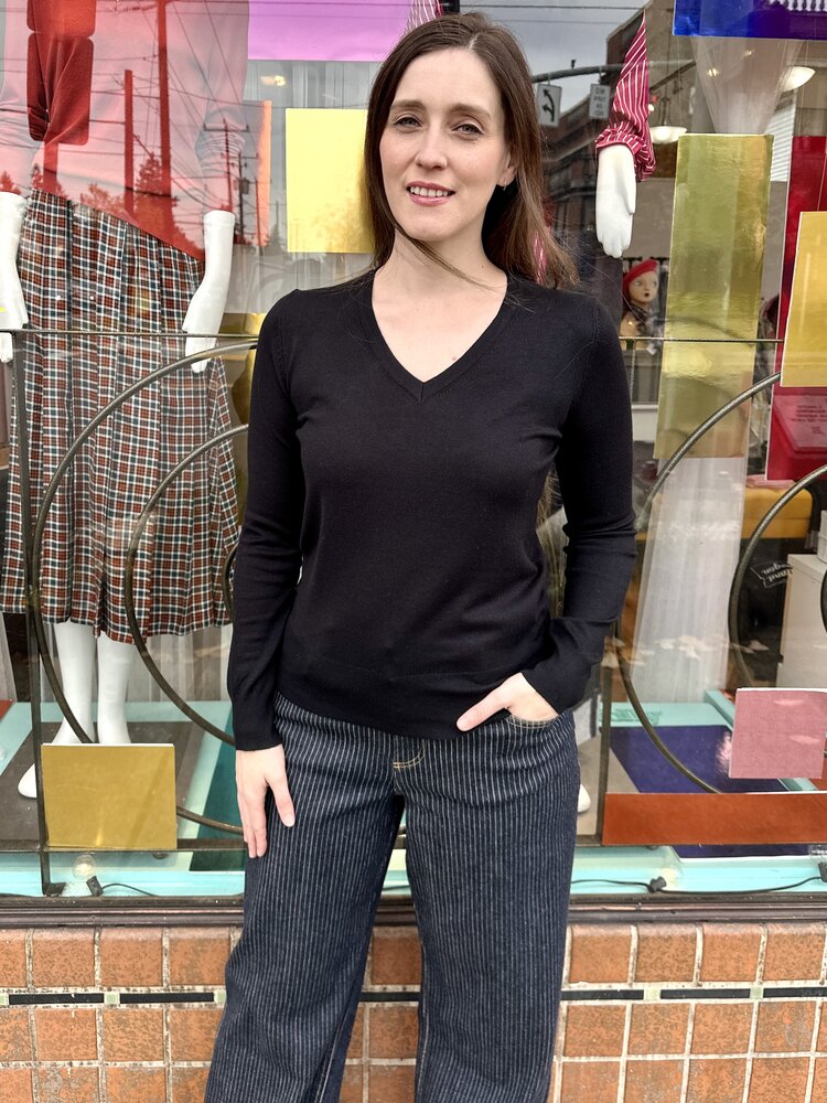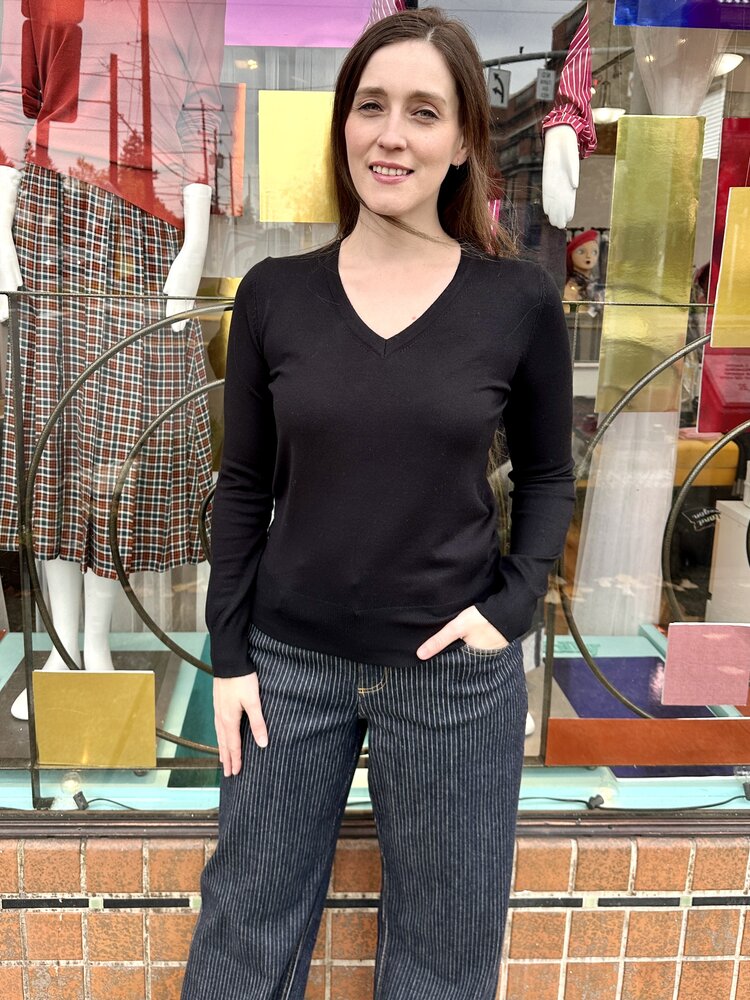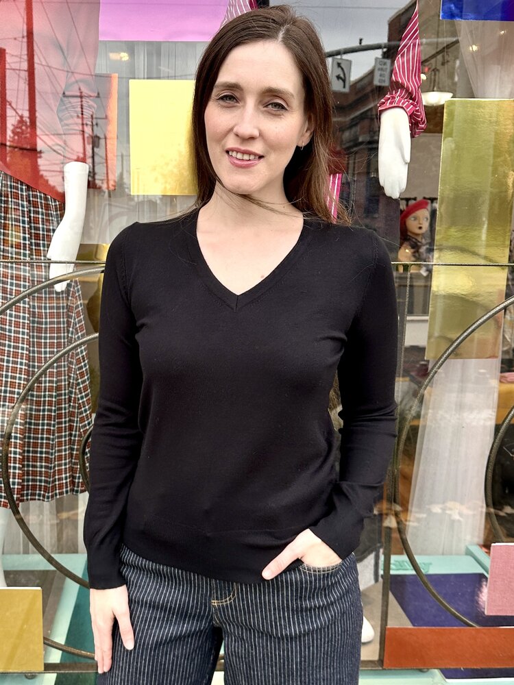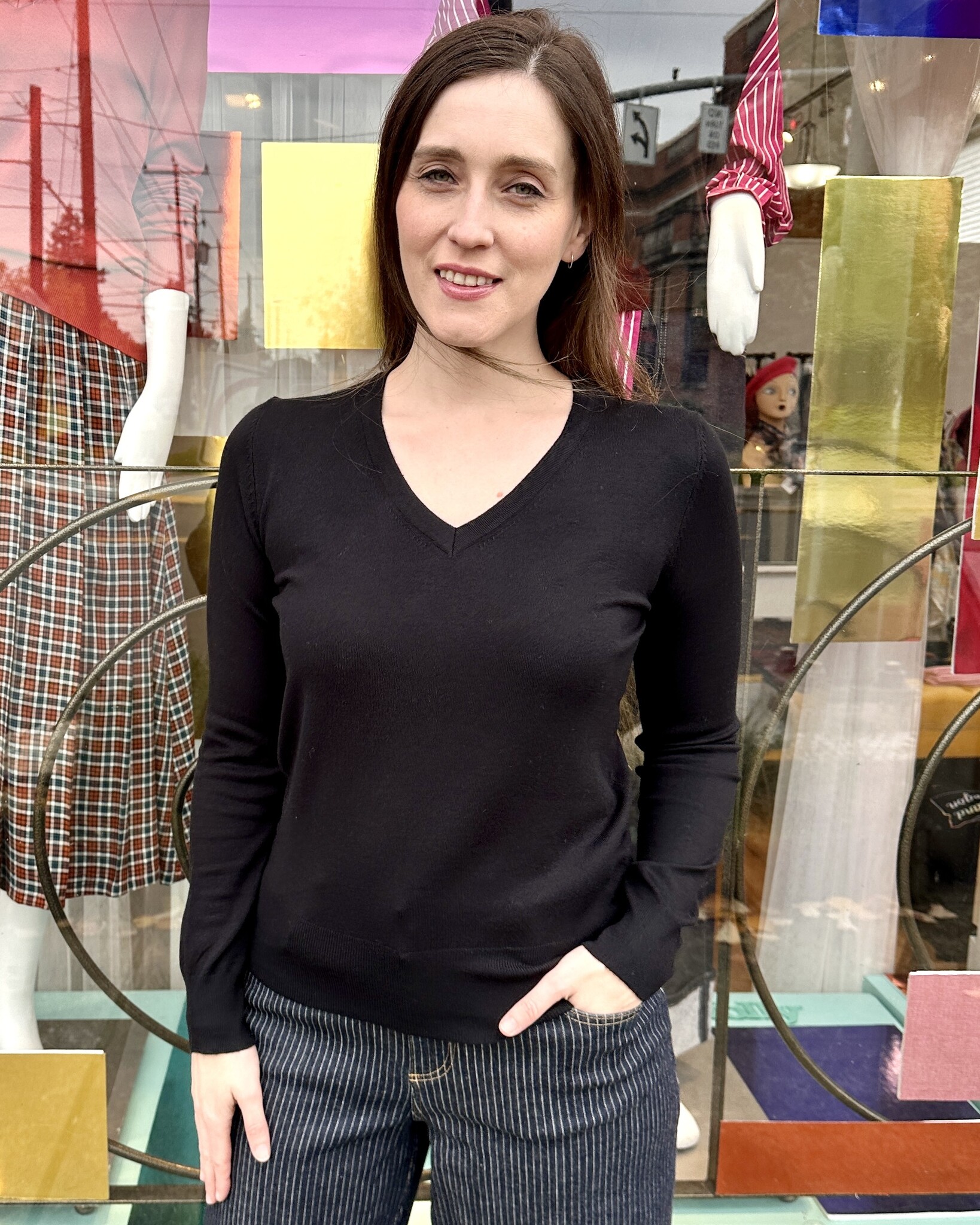 Lightweight and fitted this is a perfect basic sweater with V-neck and long sleeves.