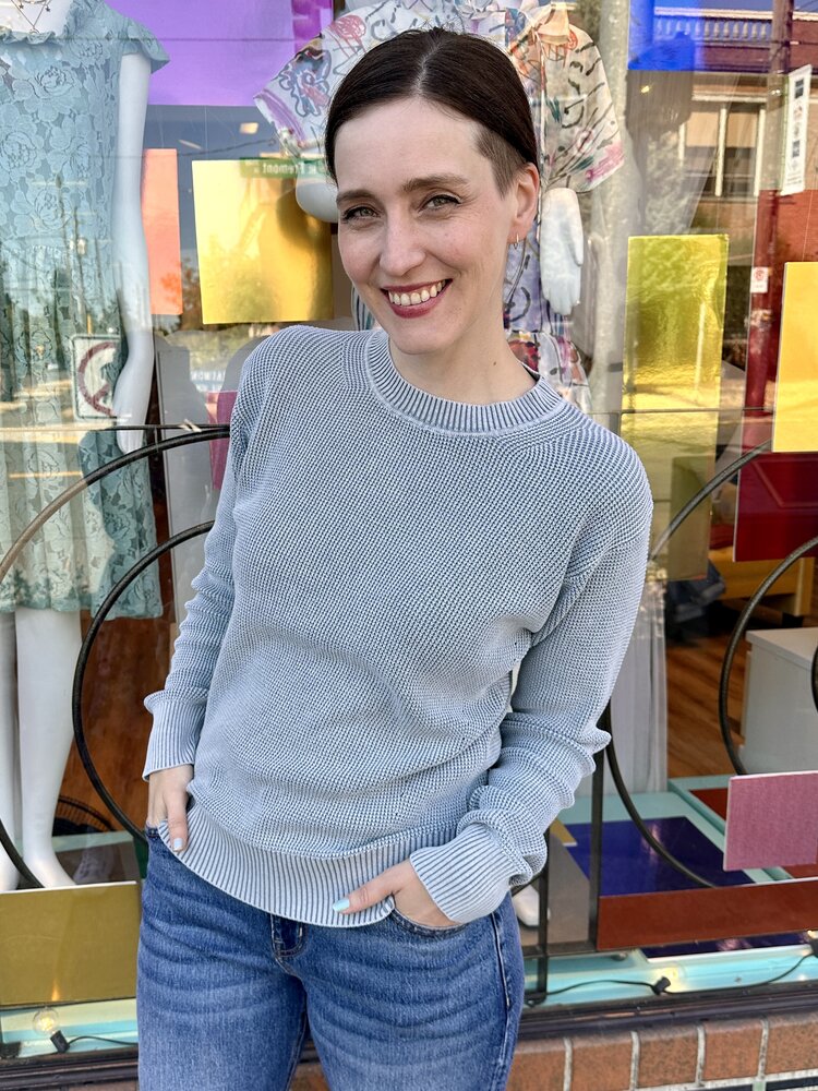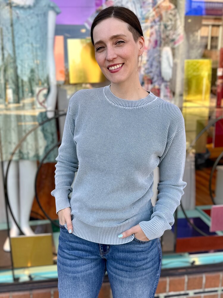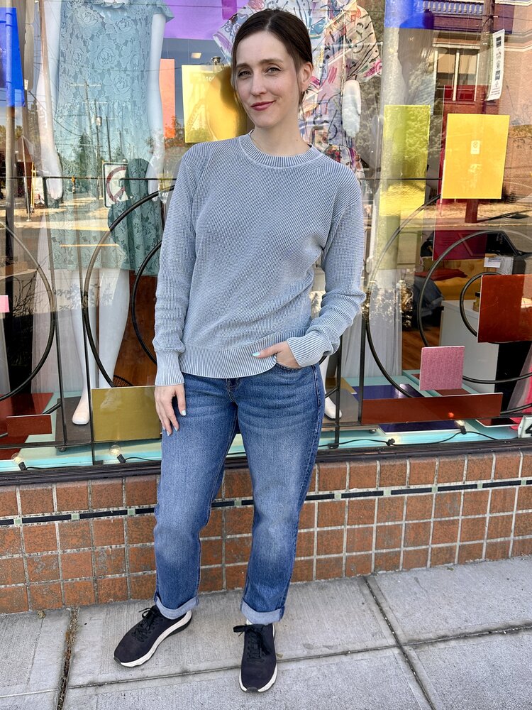 Cozy classic long sleeve sweater/tee in pretty slate blue.