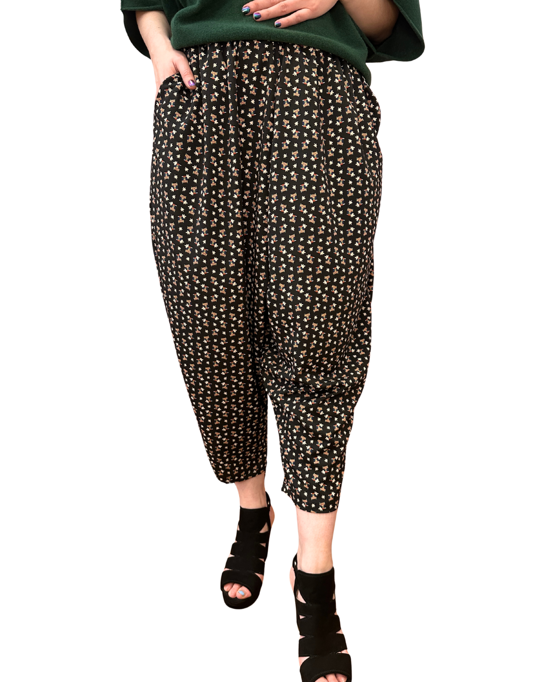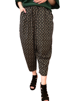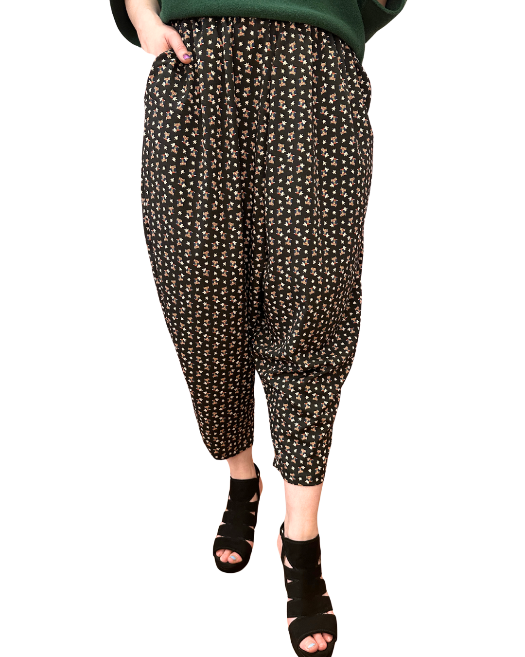 Zelda is a drop crotch, big big pockets, elastic waist and cropped with a tapered leg (no elastic at the bottom). An exaggerated balloon shaped leg. Super flowy goodness!